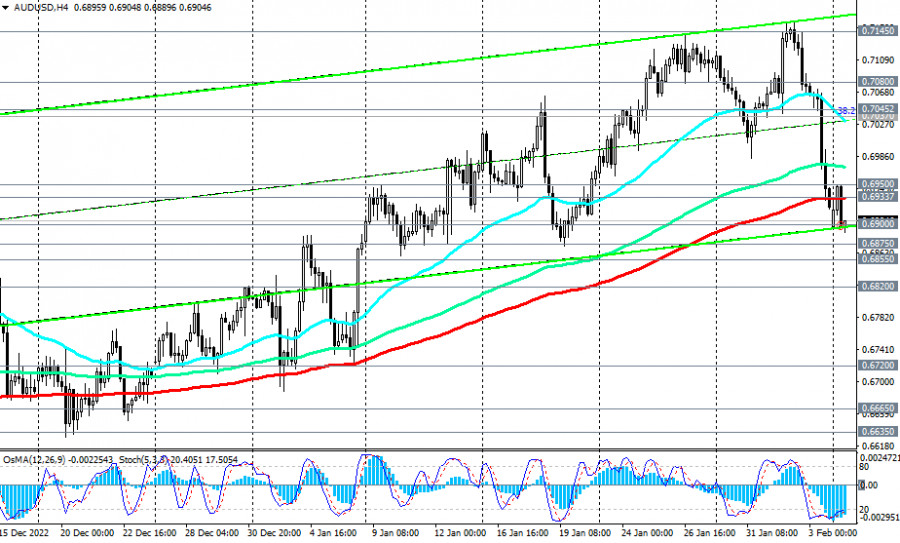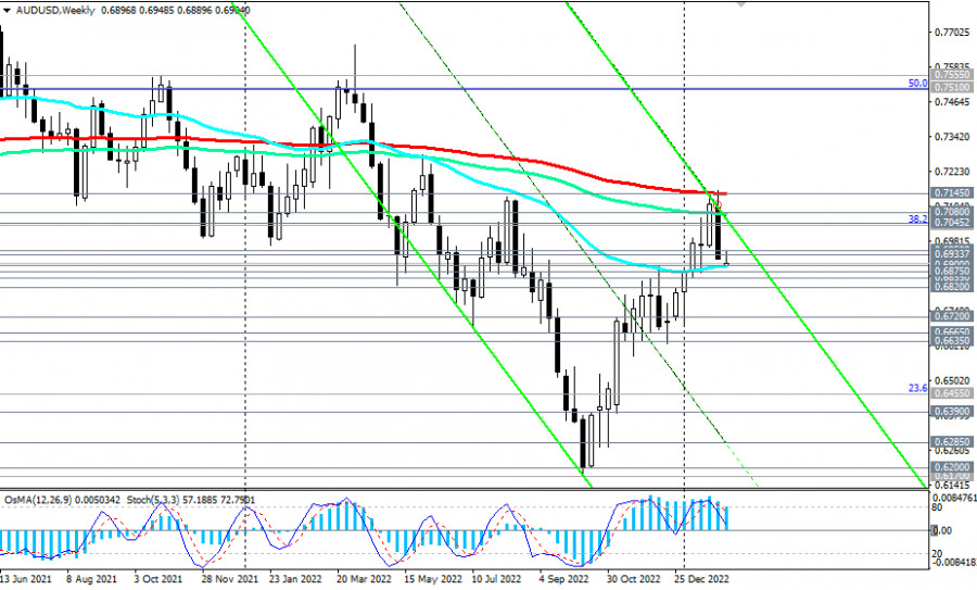 AUD/USD: сценарии динамики на 06/02/2023ИнстаФорекс - Instaforex, 2 года назад Как мы отметили в нашем сегодняшнем «Фундаментальном анализе», сильный отчет Минтруда США, опубликованный в минувшую пятницу, способствовал резкому укреплению американского доллара. Его индекс DXY смог укрепиться на 2%, а все основные валюты снизились в парах с USD. В частности, это касается пары AUD/USD, которая снизилась за минувшие 2 торговых дня на 3%. Сегодня ее снижение продолжилось, а цена достигла важного среднесрочного уровня поддержки 0.6900 (ЕМА50 на недельном графике). Сильный медвежий импульс все еще толкает пару вниз, в сторону важных уровней поддержки 0.6875 (ЕМА50 на дневном графике), 0.6855 (ЕМА200 на дневном графике). Технические индикаторы OsMA и Стохастик на дневном и недельном графиках AUD/USD также сигнализируют о возможности дальнейшего снижения. В случае пробоя важного уровня поддержки 0.6820 (ЕМА144 на дневном графике) AUD/USD вернётся в зону глобального нисходящего тренда. В альтернативном сценарии первым сигналом для возобновления длинных позиций может стать пробой уровней сопротивления 0.6934 (ЕМА200 на 4-часовом графике), 0.6950 (недавний локальный максимум). Пробой ключевого долгосрочного уровня сопротивления 0.7145 (ЕМА200 на недельном графике) и локального 7-месячного максимума 0.7157 подтвердит возврат AUD/USD в зону долгосрочного бычьего рынка. *) о событиях недели см. в Важнейшие экономические события недели 06.02.2023 – 12.02.2023 **) об особенностях торговли парой AUD/USD см. в статье AUD/USD: валютная пара (характеристики, рекомендации) Уровни поддержки: 0.6900, 0.6875, 0.6855, 0.6820, 0.6720, 0.6700, 0.6665, 0.6635 Уровни сопротивления: 0.6934, 0.6950, 0.7000, 0.7037, 0.7045, 0.7080, 0.7157