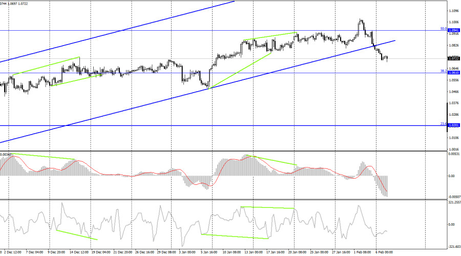 На 4-часовом графике пара продолжает процесс падения и выполнила закрепление под нижней линией восходящего трендового коридора. Я считаю этот момент очень важным, так как пара покинула коридор, в котором находилась с октября. Настроение трейдеров теперь характеризуется как «медвежье», что открывает отличные перспективы роста для американской валюты с целями 1,0610 и 1,0201. Назревающих дивергенций сегодня не наблюдается ни у одного индикатора. На последней отчетной неделе спекулянты открыли 9464 контракта Long и 2099 контрактов Short. Настроение крупных трейдеров остается «бычьим» и немного усилилось. Общее количество контрактов Long, сосредоточенных на руках спекулянтов, теперь составляет 238 тысяч, а контрактов Short – 103 тысячи. Европейская валюта в данное время продолжает расти, что соответствует данным отчетов COT, но при этом обращаю внимание, что количество Long выше числа Short почти в два с половиной раза. В последние несколько месяцев шансы на рост евровалюты постоянно росли, как и сама евровалюта, но информационный фон не всегда поддерживал именно ее. Ситуация продолжает оставаться благоприятной для евро после длительного «черного периода», поэтому ее перспективы остаются позитивными. По крайней мере, до тех пор, пока ЕЦБ повышает процентную ставку шагами по 0,50%. |