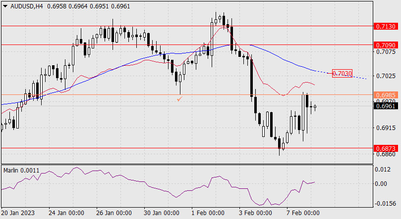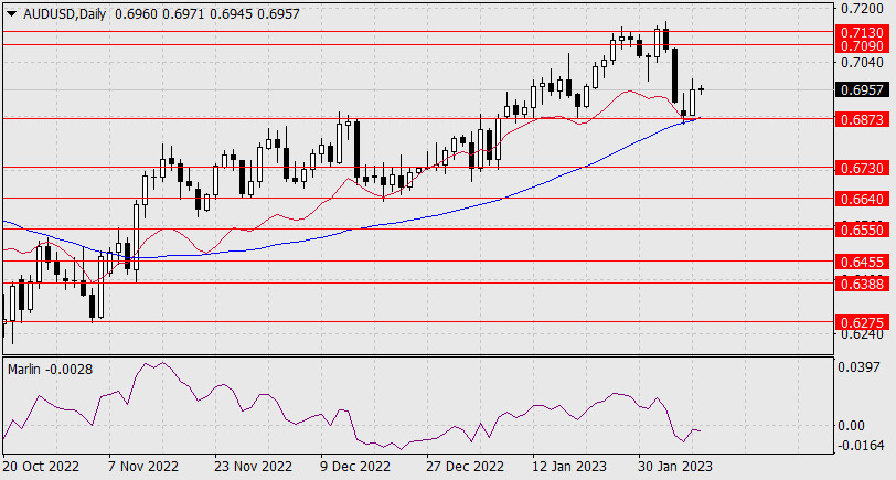 Прогноз по AUD/USD на 8 февраля 2023 годаИнстаФорекс - Instaforex, 2 года назад После отскока котировки пары AUD/USD от поддержки линии Крузенштерна дневного масштаба вчера цена подросла на 75 пунктов. Конечно, на рост повлияло и повышение ставки РБА с 3,10% до 3,35%. Но в целом на валютном рынке наметился сильный разворот к укреплению американского доллара, поэтому рост «австралийца» будет ограниченным. Даже сигнальная линия осциллятора Марлин наметила разворот вниз на подходе к границе с территорией роста. Закрепление цены под 0.6873, соответственно и под индикаторной линией Крузенштерна, направит цены в новую волну среднесрочного продвижения вниз.