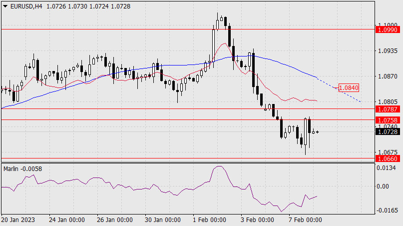Прогноз по EUR/USD на 8 февраля 2023 годаИнстаФорекс - Instaforex, 2 года назад Во вторник евро закрепился под индикаторной линией Крузенштерна дневного масштаба. Закрытие дня произошло практически на уровне открытия, но тенями были отработаны целевые уровни поддержки и сопротивления. Правда, нижняя тень не дотянула до уровня 1.0660 несколько пунктов, но можно допустить погрешность в расчёте самого уровня. Главное в том, что верхняя тень провела ретест линии Крузенштерна, чем было выполнено минимальное техническое требование для возобновления нисходящей тенденции, к следующей целевой поддержке 1.0595.