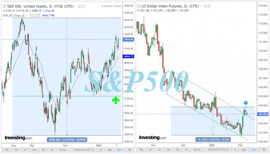 S&P 500: текущая динамика и ближайшие перспективыИнстаФорекс - Instaforex, 2 года назад Перед началом американской торговой сессии сегодня доллар продолжает сдавать завоёванные ранее позиции, умеренно снижаясь с открытия сегодняшнего торгового дня. На момент публикации данной статьи фьючерсы DXY торговались вблизи отметки 103.02, на 65 пунктов ниже 4-недельного максимума, достигнутого в начале этой недели, и отметки 103.67. Выступавший вчера в Экономическом клубе Вашингтона глава ФРС Джером Пауэлл, похоже, разочаровал участников рынка, ставивших на дальнейший рост доллара, хотя и не сказал ничего такого, чтобы могло сильно насторожить инвесторов. В общем, он повторил недавние заявления руководителей ФРС о том, что они привержены дальнейшей борьбе с высокой инфляцией, а сильный рынок труда позволяет им делать это и дальше. Пауэлл отметил сильный отчет о занятости в США, опубликованный в пятницу, оказавшийся сильнее ожиданий, и подтвердил, что потребуется дальнейшее повышение процентных ставок. "Возможно, нам придется предпринять больше действий, если мы продолжим получать сильные отчеты по рынку труда или более высокую инфляцию", - сказал Пауэлл, но также отметил, что ожидает в этом году "значительное снижение" инфляции, что, вероятно, и насторожило покупателей доллара и что заставило его снизиться по итогам вчерашнего торгового дня. Что касается упомянутого выше рынка труда США, то, как известно, в январе число рабочих мест в несельскохозяйственном секторе американской экономики выросло на 517 000 человек, а общая безработица снизилась до 3,4%, с 3,5% месяцем ранее. Данные отчета при этом оказались значительно сильнее прогнозных значений (+185 000 человек, после декабрьского роста на +260 000). В нашем недавнем обзоре Dow Jones Industrial Average и американский фондовый рынок: накануне публикации решения ФРС по процентной ставке мы уже указывали на взаимосвязь возможного уровня процентной ставки и уровня безработицы. В настоящий же момент она (безработица) остается на минимальных многолетних минимумах, в то время как уровень инфляции все еще значительно высок. Это создаёт предпосылки для дальнейшего роста уровня процентной ставки в США. Причем если опираться на приведенные в статье сравнительные таблицы, то процентная ставка может еще быть повышена (чуть ли не кратно) к текущему уровню. Завтра Минтруда США представит свежие данные с рынка труда - в части числа заявок по безработице: ожидается их небольшой относительный рост, что может, также незначительно, негативно повлиять на доллар в краткосрочной перспективе. А сегодня, в отсутствии важных публикаций макростатистики участники рынка будут следить за выступлениями (в 14:20 и 18:45 GMT) представителей руководства ФРС и членов Совета управляющих ФРС Джона Уильямса и Кристофера Уоллера. Возможно, к ним также присоединятся президент ФРБ Атланты Бостик и президент ФРБ Миннеаполиса Кашкари, хотя их комментарии имеют значительно меньшее влияние на рынки, чем главы ФРС Пауэлла. Между тем фьючерсы на основные американские фондовые индексы (NASDAQ100, S&P500, Dow Jones Industrial Average) сохраняют позитивную динамику, торгуясь в зоне бычьего рынка. Так, на текущий момент фьючерсы на американский фондовый индекс широкого рынка S&P500 торгуются вблизи отметки 4150.00, в зоне 6-месячных максимумов, достигнутых 02 февраля вблизи отметки 4195.00. Выше ключе
