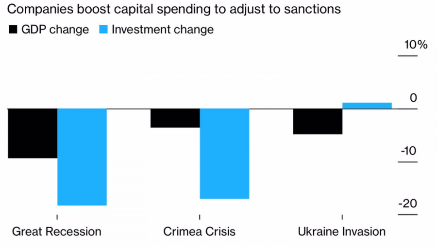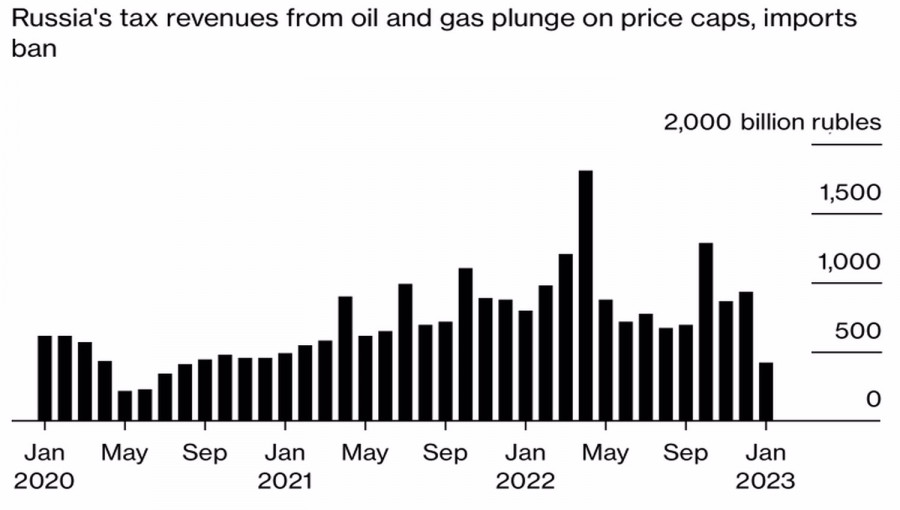 Рубль потерял палочку-выручалочкуИнстаФорекс - Instaforex, 2 года назад Сколько веревочке ни виться, а конец всегда один. Сокращение налоговых поступлений и дыры в бюджете являются закономерным итогом колоссальных западных санкций против России и серьезно ослабляют рубль. И если в 2022 меньшему, чем ожидалось, сокращению экономики РФ способствовал неожиданный рост инвестиций в основной капитал, то в 2023 такой палочки-выручалочки уже не будет. Паре USDRUB суждено восстановить восходящий тренд и устремиться к новым высотам. Динамика ВВП и инвестиций в России В январе налоговые доходы России от продажи нефти и газа сократились на 46%, а расходы выросли на 59%. В результате дефицит бюджета расширился до 1,76 трлн руб., что эквивалентно $25 млрд. Планируемое Минфином троекратное увеличение продаж иностранной валюты на $2,3 млрд с 7 февраля по 6 марта является временной поддержкой рубля и не гарантирует стабилизации его курса. Несмотря на то что Россия перенаправляет потоки нефти с Запада на Восток, а азиатские страны формально не поддерживают введенный G7 потолок цен в $60, санкции позволяют им торговаться. В конце января российские нефтяные компании предлагали Индии и Китаю скидки в размере $15-20 за баррель. Еще $15-20 за баррель они платили судоходным компаниям за доставку черного золота в столь отдаленные регионы. В результате стоимость Ural упала ниже $50, что на 42% меньше, чем за аналогичный период прошлого года. Неудивительно, что доходы от продажи энергоносителей сократились на 46%, а дефицит бюджета так вырос. Динамика доходов России от продажи нефти и газа Таким образом, дела в Российской экономике отражаются на динамике USDRUB. Ралли пары способствуют падение цен на нефть на мировом рынке и укрепление доллара США на фоне увеличения предполагаемого потолка ставки по федеральным фондам до 5,1%. При этом на рынок вливаются крупные деньги, ожидающие увидеть стоимость заимствований на уровне 6%. Если так все и будет, то американская валюта продолжит укрепляться, подливая масла в огонь восходящего движения USDRUB. Сокращение валютной выручки, дыры в бюджете и стагнация экономики создают серьезные проблемы для российской валюты. В настоящий момент ключевая ставка составляет 7,5%, и ни один специалист не ожидает ее изменения на февральской встрече Банка России. Технически на дневном графике USDRUB «быки» намереваются восстановить восходящий тренд. Первый из двух ранее поставленных таргетов по лонгам на 72,5 и 75,5 уже выполнен. При этом успешный штурм сформированного пивот-уровнем на 73 сопротивления позволит нарастить длинные позиции. В дальнейшем пара способна подняться не только к 75,5, но и к 77,5 и 80,5. Материал предоставлен компанией InstaForex - www.instaforex.com |