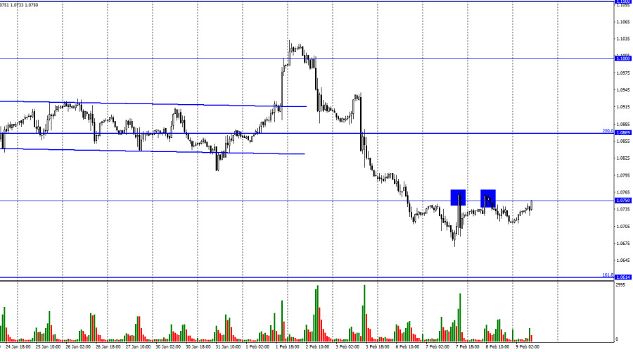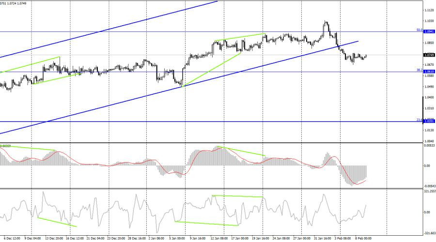 EUR/USD. 9 февраля. Инфляция в Германии увеличилась на 0,1%ИнстаФорекс - Instaforex, 2 года назад Добрый день, уважаемые трейдеры! Пара EUR/USD в среду выполнила новый возврат к уровню 1,0750, отбой от него и небольшое падение. В четверг – новый возврат к уровню 1,0750. Закрепление курса пары над этим уровнем сработает в пользу продолжения роста в направлении следующего уровня коррекции 200,0% – 1,0869. Новый отбой – падение (вероятно, небольшое) в направлении коррекционного уровня 161,8% – 1,0614. Трейдеры-быки начали атаковать уровень 1,0750 на фоне роста инфляции в Германии. Что означает этот факт? В январе индекс потребительских цен увеличился на 0,1% до 8,7%, хотя трейдеры ждали более сильного роста. Почему ждали, если ставка ЕЦБ продолжает расти на каждом заседании, а сама инфляция уже несколько месяцев снижается? На мой взгляд, проблема заключается в том, что первая реакция показателя на ужесточение ДКП и падение цен на нефть и газ уже прошла. Инфляция отреагировала на оба фактора, но, как и на любом рынке, теперь ей нужны новые причины, чтобы продолжать замедление. Для евровалюты новый рост инфляции и хорошо, и плохо одновременно. С одной стороны, теперь ЕЦБ может решиться продлить программу ужесточения ДКП еще на несколько заседаний, так как текущего размера ставки не хватает для обеспечения постоянного снижения инфляции. С другой стороны, высокая инфляция будет все больше и больше тормозить экономический рост в ЕС, если ставка действительно будет продолжать расти. Это для евровалюты высокие ставки – хорошо, а для европейской экономики – это плохо. Только недавно все рассуждали о рецессии в европейской экономике, потом вроде бы сошлись во мнении, что сильного спада не будет, но новый рост индекса потребительских цен нарушает планы центрального банка. Безусловно, судить о европейской инфляции по немецкой неправильно. Нужно дождаться показателя по ЕС, а потом делать выводы. Но «звоночек» очень тревожный. Впрочем, может быть это разовое помутнение и дальше инфляция возобновит снижение на фоне ожидаемого повышения ставки ЕЦБ еще на 0,75%. На 4-часовом графике пара продолжает процесс падения и выполнила закрепление под восходящим трендовым коридором. Я считаю этот момент очень важным, так как пара покинула коридор, в котором находилась с октября. Настроение трейдеров теперь характеризуется как «медвежье», что открывает отличные перспективы роста для американской валюты с целями 1,0610 и 1,0201. Назревающих дивергенций сегодня не наблюдается ни у одного индикатора. Отчет Commitments of Traders (COT):