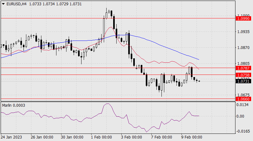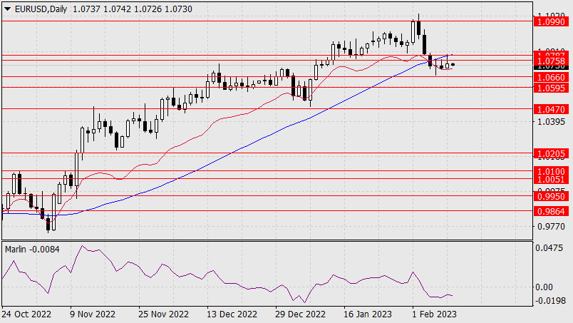 Прогноз по EUR/USD на 10 февраля 2023 годаИнстаФорекс - Instaforex, 2 года назад Вчера евро сделал ещё один неудачный бросок вверх, пусть экстремум броска и был выше теней предшествующих двух дней. На этот раз рост был остановлен в точке пересечения целевого уровня 1.0787 (точнее, верхней границей целевого диапазона 1.0758/87) и индикаторной линии Крузенштерна дневного масштаба. Осциллятор Марлин продвигается вбок. В целом наблюдается консолидация евро под указанным целевым диапазоном. По основному сценарию ждём снижение к 1.0595. Закрепление под уровнем открывает цель 1.0470. Вчера цена приблизилась к индикаторной линии баланса и развернулась от неё, что может означать завершение коррекции. Цена закрепилась под 1.0758. Осциллятор Марлин находится на границе с территорией понижающейся тенденции, ожидая дополнительного сигнала для перехода в зону снижения. По всей видимости, такой сигнал поступит после преодоления ценой вчерашнего минимума 1.0710. |