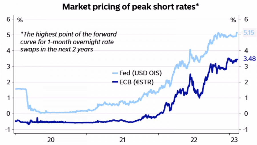 Евро теряет веру в себяИнстаФорекс - Instaforex, 2 года назад Рынки оказались настолько потрясены результатами заседаний ФРС и ЕЦБ, а также статистикой по американской занятости за январь, что не могут прийти в себя на протяжении целой недели. Повышение ставки по федеральным фондам на 25 б.п, ставки по депозитам на 50 б.п и последующие спичи глав центробанков были восприняты как события с «голубиным» оттенком, что позволило фондовым индексам вырасти. Тем не менее, суровая реальность вернула их с небес на землю. Падение глобального аппетита к риску заставляет EURUSD чувствовать себя не в своей тарелке. Если отнестись к статистике по американской занятости с определенной долей скептицизма, ссылаясь, что в январе у данных традиционно много шума, то по сути ничего не изменилось. Да, рынки ожидают повышения ставки по федеральным фондам не до 4,9%, а до 5,1%. Но ЕЦБ все равно будет двигаться быстрее. Он намерен увеличить стоимость заимствований на 100 б.п. Динамика предполагаемых потолков по ставкам ФРС и ЕЦБ Да, чиновники FOMC говорят, что им, вероятнее всего, придется сделать больше, чем предполагалось, однако риторика их коллег из ЕЦБ не менее «ястребиная». Напротив, заявления, что стоимость заимствований вырастет на 50 б.п не только в марте, но и в мае, выглядят весьма агрессивно. Еврозона по-прежнему неплохо смотрится, Китай открывается, почему бы EURUSD не вернутся к ралли? Citigroup считает, что так и будет. Если ФРС не поднимет ставку до 6%, евро вырастет до 1,14-1,15 в течение нескольких месяцев, так что текущий откат предоставляет отличную возможность для покупки. Однако, на мой взгляд, не нужно забывать, что у региональной валюты есть свои уязвимые места. В частности, пока не понятно, сможет ли экономика еврозоны выдержать цикл агрессивного ужесточения денежно-кредитной политики ЕЦБ? Не возникнут ли проблемы у проблемных с точки зрения долговой нагрузки стран? Не расширятся ли спреды доходности итальянских и немецких облигаций, что в конечном итоге заставит Европейский центробанк от решительности перейти к осторожности. Динамика дифференциала доходности облигаций Италии и Германии Сильный отчет о занятости и «ястребиная» риторика членов FOMC, к которой нынче прислушиваются, а не пропускают мимо ушей, вернули интерес инвесторов к доллару США. Он уже не выглядит мальчиком для битья как в октябре-январе. Не думаю, что паре EURUSD будет легко вернуться к ралли. Скорее всего, нас ожидает продолжительная консолидация. И в таких условиях самое главное – правильно определить ее границы. Подсказку наверняка даст релиз данных по американской инфляции за январь. Пока же основная валютная пара топчется на месте. Технически неспособность «быков» по EURUSD вернуться в границы диапазона справедливой стоимости 1,075-1,091 и подняться выше голубой скользящей средней говорит об их слабости. Сформированные по предыдущим рекомендациям от уровня 1,0745 короткие позиции имеет смысл наращивать. При этом падение пары ниже 1,067 усилит риски продолжения пике к 1,06. Материал предоставлен компанией InstaForex - www.instaforex.com |