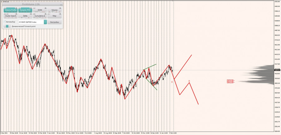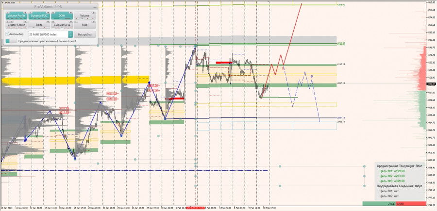 Среднесрочная тенденция: в лонг. Максимальное скопление объемов среднесрочной тенденции расположено в диапазоне по котировкам 3826.00-3837.00, 3991.00-4002.00, 41050.00-4065.00 и 4073.00-4087.00. В настоящий момент по SNP500 совершаются инвестиционные операции выше, указывая на силу покупателей.