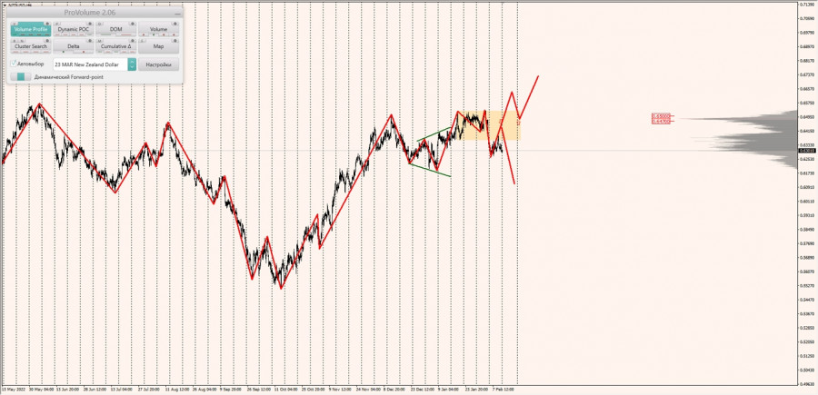 Долгосрочная тенденция: временная неопределённость. Максимальное скопление объемов текущего контракта расположено в диапазоне по котировкам 0.64700-0.65000. В настоящий момент по паре совершаются инвестиционные операции ниже, указывая на силу продавцов.