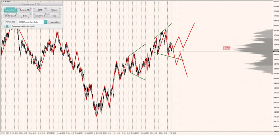 Среднесрочная тенденция: в шорт. Максимальное скопление объемов среднесрочной тенденции расположено в диапазоне по котировкам 0.69220-0.69320. В настоящий момент по паре совершаются инвестиционные операции ниже, указывая на силу продавцов.