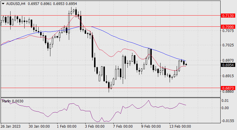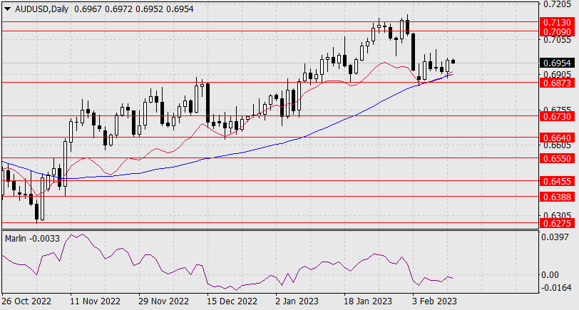 Прогноз по AUD/USD на 14 февраля 2023 годаИнстаФорекс - Instaforex, 2 года назад Австралийский доллар вчера отскочил от поддержки линии Крузенштерна, закрыл день ростом на 47 пунктов. Сегодня утром наблюдается небольшое снижение цены, осциллятор Марлин показывает намерение развернуться вниз на подходе к нейтральной нулевой линии. Первым признаком серьёзности такого намерения развернуться будет преодоление линии Крузенштерна (0.6910). Подтверждающим признаком станет преодоление поддержки 0.6873 – минимума 19 января. В случае успеха откроется цель 0.6730.