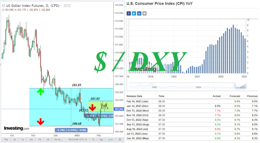 Доллар: краткие итоги и ближайшие перспективыИнстаФорекс - Instaforex, 2 года назад Как мы отметили в нашем вчерашнем обзоре EUR/USD: краткие итоги и ближайшие перспективы, «рынку нужны новые драйверы», а участникам рынка, следящим за котировками доллара, - новая информация относительно текущей экономической ситуации в США. В связи с этим сегодня в центре внимания участников рынка находится публикация 13:30 (GMT) отчета Бюро трудовой статистики США с данными по инфляции в стране на январь. Сразу отметим, что, по прогнозу, ожидается падение годового показателя CPI в США до 6,2% с 6,5% в декабре. Годовой базовый CPI также снизился, по прогнозу, в январе до 5,5%, с 5,7% месяцем ранее. Это негативная для доллара информация, и мы видим, как доллар и его индекс DXY снижаются с открытия сегодняшнего торгового дня. Так, на момент публикации данной статьи фьючерсы DXY торговались вблизи отметки 102.86, примерно на 100 пунктов ниже локального 6-недельного максимума 103.85, достигнутого на прошлой неделе. Укреплению доллара и росту его индекса способствовал опубликованный в начале месяца отчет Минтруда США с данными за январь. Согласно данному отчету, в январе число рабочих мест в несельскохозяйственном секторе американской экономики выросло на 517 000 человек, а общая безработица снизилась до 3,4% с 3,5% месяцем ранее. Данные отчета при этом оказались значительно сильнее прогнозных значений (+185 000 человек, после декабрьского роста на +260 000). При этом рост средней почасовой оплаты труда американцев продолжился в январе. Сразу после публикации данного отчета доллар резко укрепился, а его индекс DXY закрыл торговый день пятницы на отметке 102.75, на 2% выше локального 10-месячного минимума 100.68, достигнутого накануне публикации. Но, как считают экономисты, и как мы отметили в нашем недавнем обзоре, этого пока еще недостаточно, чтобы доллар смог переломить негативную динамику. Все еще стоит угроза возобновления снижения DXY в сторону психологически важной отметки 100.00. Пробой недавнего локального минимума 100.68 вновь актуализирует данный сценарий, а пробой локального уровня поддержки 102.52 станет первым сигналом. Пробой же круглого уровня 100.00 придаст снижению доллара новый импульс, направив DXY сторону минимумов 2-летней давности и отметки 90.00 (более подробно и альтернативный сценарий см. в Индекс доллара #USDX: сценарии динамики на 14.02.2023). Таким образом, сегодняшняя публикация отчета Бюро трудовой статистики США с данными по инфляции станет ключевой для доллара и направления его движения на ближайшие дни, не исключено, что и до начала следующего месяца, когда (предварительно 10 марта) будет опубликован очередной ежемесячный отчёт Минтруда США с данными уже за февраль. Если же сегодняшние данные по инфляции укажут на еще более сильное ее замедление, то доллар ждет резкое снижение. В настоящий момент доллар все же получает поддержку от напряжённой геополитической ситуации в мире и от все ещё остающейся высокой инфляции. Кстати, стоит отметить, что, согласно опубликованному в минувшую пятницу отчету Мичиганского университета, компонент отчета в части инфляционных ожиданий американцев в перспективе года вырос до 4,2% (с 3,9% месяцем ранее). По заявлениям же руководителей ФРС, сделанным по итогам завершившегося 1 февраля заседания, потребуется дальнейшее повышение ставок, т.к. инфляция все еще остаётся