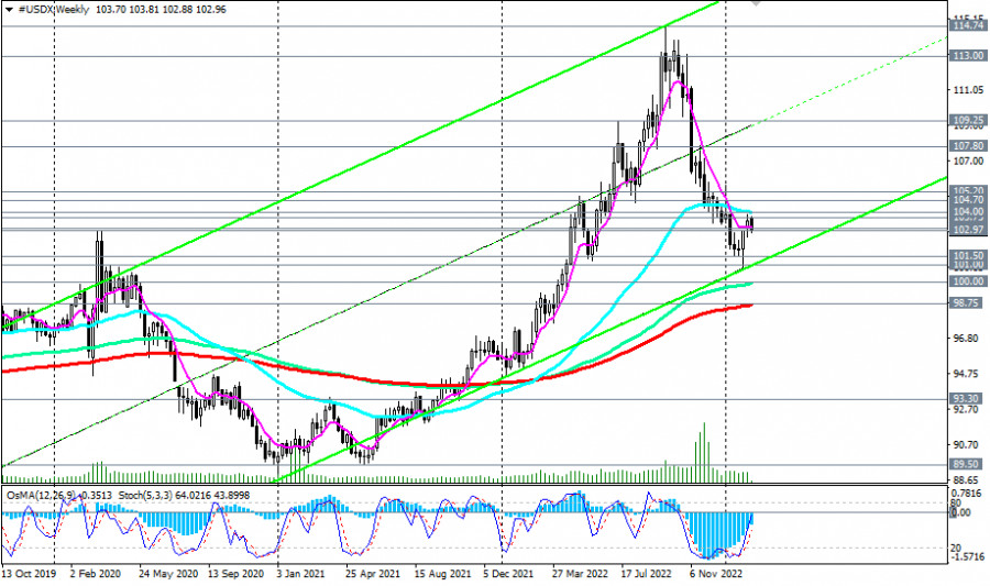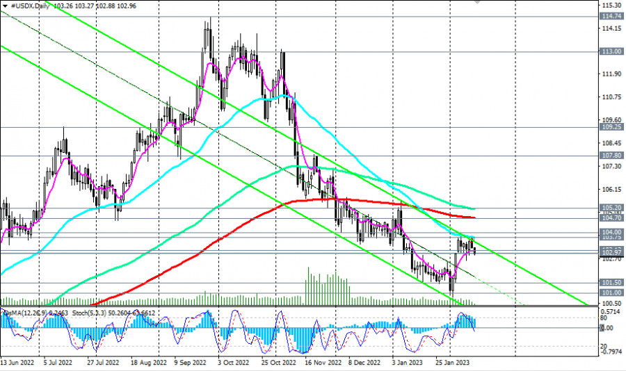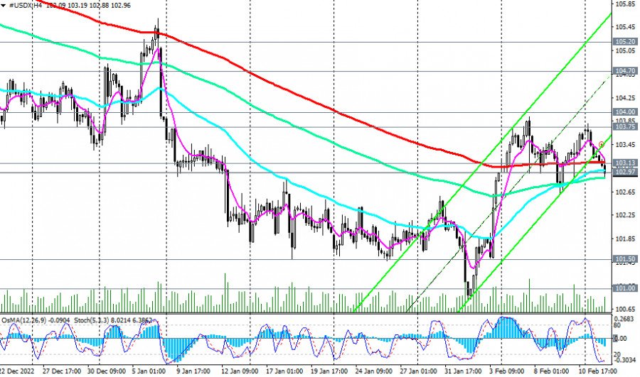 Индекс доллара #USDX: сценарии динамики на 14.02.2023ИнстаФорекс - Instaforex, 2 года назад Как мы отметили в нашем сегодняшнем «Фундаментальном анализе», доллар и его индекс DXY снижаются с открытия сегодняшнего торгового дня. Так, на момент публикации данной статьи фьючерсы DXY (CFD #USDX в торговом терминале МТ4) торговались вблизи отметки 102.86, примерно на 100 пунктов ниже локального 6-недельного максимума 103.85, достигнутого на прошлой неделе. Пробой сегодняшнего локального минимума 102.88 может стать сигналом для возобновления коротких позиций по DXY с целями на локальных уровнях поддержки 101.50, 101.00. В случае дальнейшего снижения целями станут ключевые уровни поддержки 100.00 (ЕМА144 на недельном графике), 98.75 (ЕМА200 на недельном графике). Пробой же долгосрочного уровня поддержки 93.30 (ЕМА200 на месячном графике) подтвердит окончательный возврат доллара и его индекса DXY в зону глобального нисходящего тренда. В альтернативном сценарии и после пробоя уровней сопротивления 103.75 (ЕМА50 и верхняя линия нисходящего канала на дневном графике), 104.00 (ЕМА50 на недельном графике) DXY возобновит рост, направившись в сторону ключевых уровней сопротивления 104.70 (ЕМА200 на дневном графике), 105.20 (ЕМА144 на дневном графике). Их пробой подтвердит сценарий возобновления долгосрочного бычьего тренда DXY. Первым сигналом для реализации данного сценария станут пробои уровней сопротивления 103.13 (ЕМА200 на 4-часовом графике), 103.27 (сегодняшний локальный максимум). А сегодня участники рынка, следящие за котировками доллара, будут внимательно следить за публикацией (в 13:30 GMT) свежих данных по инфляции в США (см. наш сегодняшний обзор Доллар: краткие итоги и ближайшие перспективы). Уровни поддержки: 102.88, 102.00, 101.50, 101.00, 100.00, 98.75 Уровни сопротивления: 103.13, 103.27, 103.75, 104.00, 104.70, 105.20, 107.80, 109.25