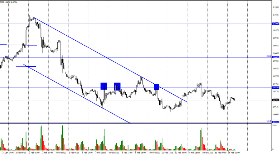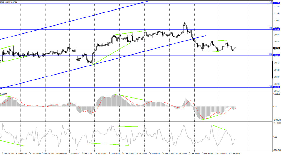 EUR/USD. 16 февраля. Лагард: оценка результатов борьбы с инфляцией произойдет в мартеИнстаФорекс - Instaforex, 2 года назад Добрый день, уважаемые трейдеры! Пара EUR/USD в среду продолжала процесс падения в направлении уровня коррекции 161,8%, 1,0614. Лишь в конце дня был выполнен разворот в пользу валюты ЕС и небольшой рост. Движение сейчас фактически горизонтальное. Таким образом, развороты могут происходить практически где угодно. Настроение трейдеров не стало «бычьим» после закрытия над нисходящим трендовым коридором. Вчерашний день был достаточно интересным в информационном плане, но важных событий для евро и доллара было не очень много. Трейдеры больше внимания сосредоточили на отчете по инфляции в Великобритании. Тем не менее в Евросоюзе состоялось выступление Кристин Лагард, которая заявила в очередной раз, что в марте ставка будет повышена на 0,50%. Так как ЕЦБ вряд ли откажется от дальнейшего повышения ставки резко, то в мае можно на 100% ожидать повышения ставки еще на 0,25%. Напомню, что именно такой сценарий трейдеры и рассматривают уже полтора месяца как основной, поэтому слова Лагард никоим образом не стали для них неожиданностью. Также президент ЕЦБ заявила, что по итогам встречи в марте будет произведен тщательный анализ темпов снижения инфляции и определен дальнейший путь денежно-кредитной политики. Из этих слов следует, что ЕЦБ готовится к замедлению темпов ужесточения, хотя не все члены ЕЦБ поддерживают это. Некоторые считают, что ставку нужно поднять по 0,50% еще минимум два раза. Инфляция в Евросоюзе замедляется, но не слишком быстро, а ранний отказ от быстрого ужесточения может остановить процесс движения инфляции к 2%. Если судить только по индексу потребительских цен, то ставка должна продолжать увеличиваться, пока инфляция не скатится хотя бы к 5%. Но та риторика, которую озвучила Лагард, пока что не поддерживает евро, так как рынок с ней отлично знаком. На 4-часовом графике пара выполнила закрепление под восходящим трендовым коридором. Я считаю этот момент очень важным, так как пара покинула коридор, в котором находилась с октября. Настроение трейдеров теперь характеризуется, как «медвежье», что открывает отличные перспективы роста для американской валюты с целями 1,0610 и 1,0201. Новая «медвежья» дивергенция у индикатора CCI повышает шансы на дальнейшее падение пары. Отчет Commitments of Traders (COT):