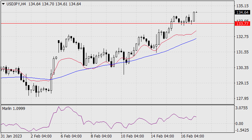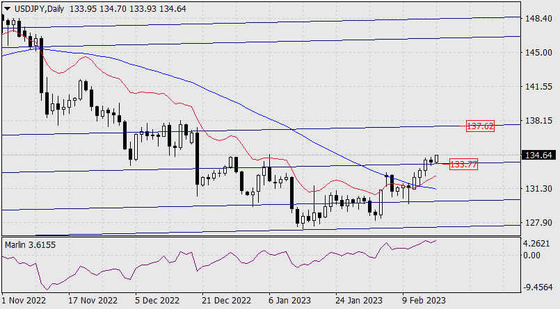 Прогноз по USD/JPY на 17 февраля 2023 годаИнстаФорекс - Instaforex, 2 года назад В среду пара USD/JPY преодолела сопротивление вложенной линии глобального ценового канала с отметкой 133.77. В четверг произошло закрепление над уровнем, а сегодня в азиатскую сессию пара продолжила рост. Теперь цене предстоит с той или иной степенью трудности пройти путь до целевого уровня 137.62. Осциллятор Марлин закрепился на положительной территории и готов цене в этом помогать.