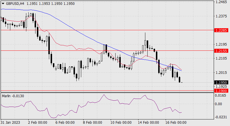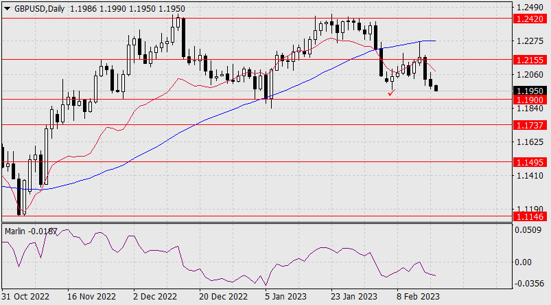 Прогноз по GBP/USD на 17 февраля 2023 годаИнстаФорекс - Instaforex, 2 года назад Британский фунт уже более настойчиво приближается к целевой поддержке 1.1900 (минимум 30 ноября), сегодня утром преодолён ближайший минимум от 7 февраля (галочка на daily). Закрепление под уровнем открывает цель 1.1737 (вершина 13 сентября 2022 года). Осциллятор Марлин ровно снижается на отрицательной территории, задел для продвижения вниз у него существенный.