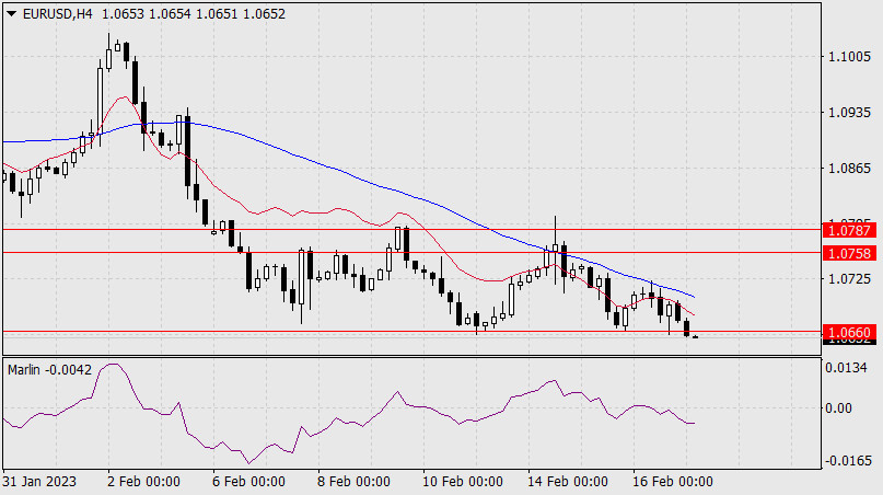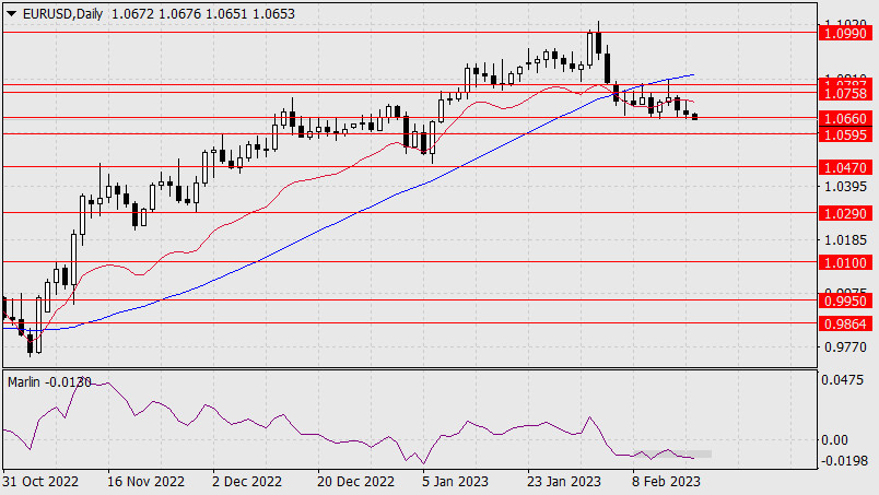 Прогноз по EUR/USD на 17 февраля 2023 годаИнстаФорекс - Instaforex, 2 года назад Евро немного отстаёт в падении от других контрдолларовых валют, но всё же развивается по основному понижающемуся сценарию. Вчера поддержка 1.0660 в очередной раз устояла, но сегодняшнее утро началось с продавливания данного уровня. Также и сигнальная линия осциллятора Марлин дневного масштаба пытается выйти из собственной консолидации вниз. Формально цель 1.0595 можно считать открытой. Преодоление уровня откроет цель 1.0470 – минимум 28 апреля 2022 года.