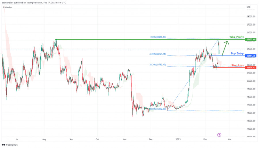 BTC/USD: ожидается рост до уровня сопротивления. Прогноз на 17 февраля 2023 г.ИнстаФорекс - Instaforex, 2 года назад На 4-часовом графике пара BTC/USD торгуется в бычьем тренде. В настоящее время цена находится выше облака Ишимоку, что указывает на бычий импульс. Рекомендуется покупать на откате на уровне 22896.54, где расположены уровень поддержки и уровень коррекции Фибоначчи 23.6%. Стоп-лосс ордер может быть установлен на уровне 21635.17, соответствующем недавнему минимуму и уровню коррекции Фибоначчи 38.2%. Прибыль может быть зафиксирована на уровне 25152.46, где находится уровень свинг-хай. Торговая рекомендация Вход: 22896.54 Условия для входа: уровень поддержки + уровень коррекции Фибоначчи 23.6% Тейк-профит: 25152.46 Условия для фиксации прибыли: уровень свинг-хай Стоп-лосс: 21635.17 Условия для активации ордера стоп-лосс: недавний минимум + 38.2% уровень коррекции Фибоначчи Материал предоставлен компанией InstaForex - www.instaforex.com |