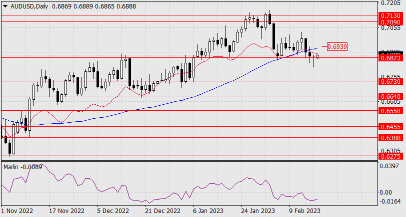 Прогноз по AUD/USD на 20 февраля 2023 годаИнстаФорекс - Instaforex, 2 года назад В пятницу австралийский доллар проник под уровень поддержки 0.6873 на 60 пунктов, но к закрытию дня вернулся к указанному уровню и сейчас пытается на нём задержаться. Уровень чем-то привлекает цену, так как осциллятор Марлин дневного масштаба уже третью сессию движется строго вбок. Этим обстоятельством подтверждается важность уровня, соответственно, закрепление под ним сможет открыть цене путь к целевой поддержке 0.6730. Как и прежде, цена закреплена под индикаторными линиями баланса и Крузенштерна, что говорит о развитии цены в основном нисходящем русле.