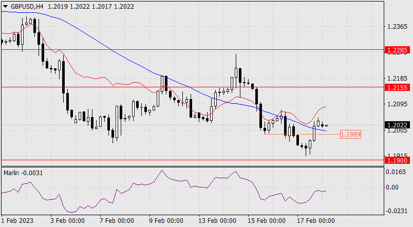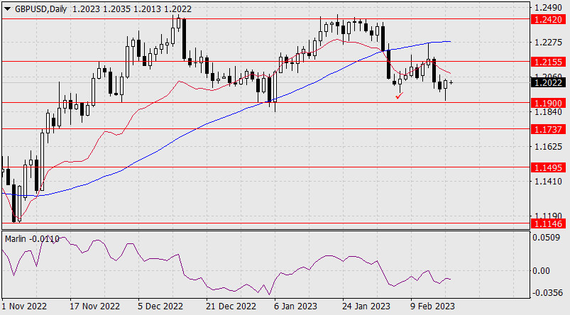 Прогноз по GBP/USD на 20 февраля 2023 годаИнстаФорекс - Instaforex, 2 года назад Не смотря на мощную попытку фунта отработать целевую поддержку 1.1900 в пятницу, день был закрыт белой свечой в 52 пункта. В понедельник утром сигнальная линия осциллятора Марлин делает попытку разворота вниз и это пока единственный признак возможной повторной атаки цены на поддержку 1.1900. Преодоление уровня откроет следующую цель 1.1737.
