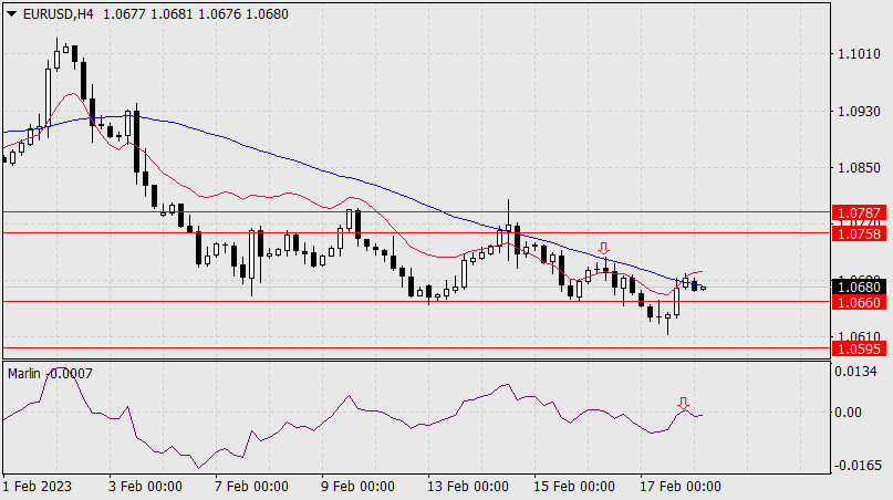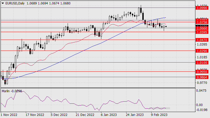 Прогноз по EUR/USD на 20 февраля 2023 годаИнстаФорекс - Instaforex, 2 года назад Пятничный бросок вниз на 60 пунктов евро закрепить не смог. День был закрыт небольшой белой свечой и сегодня утром котировка находится в диапазоне 16-го февраля (четверга). Показания индикаторов за последние два дня не изменились, цена, как и тогда, готовится к преодолению поддержки 1.0660. надеемся, что на этот раз преодоление уровня будет с закреплением. Если такое произойдёт, то дальнейший путь пары EUR/USD к целевому уровню 1.0470 будет заметно облегчён. Также мы ждём выхода сигнальной линии осциллятора Марлин из собственной консолидации вниз. Данная формация отмечена на дневном графике серым прямоугольником.