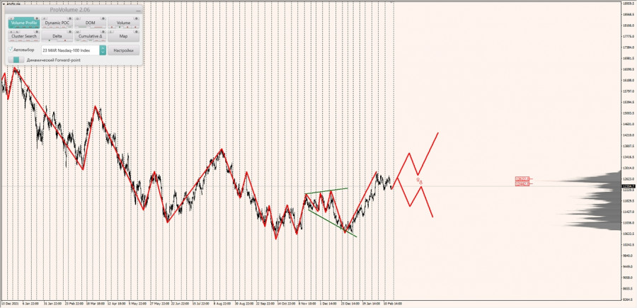 Альтернативный сценарий: при закреплении котировок индекса Nasdaq ниже зоны 1/2 (12323.2) при откатах искать продажи по паттерну в новом диапазоне выгодных цен с целями: обновление максимумов и тестирование верхней границы НКЗ (11967.7).