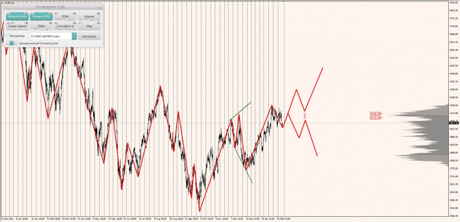 Альтернативный сценарий: при закреплении котировок индекса SNP500 выше зоны 1/2 (4162.95) при откатах искать покупки по паттерну в новом диапазоне выгодных цен с целями: обновление максимумов и тестирование нижней границы НКЗ (4258.35).