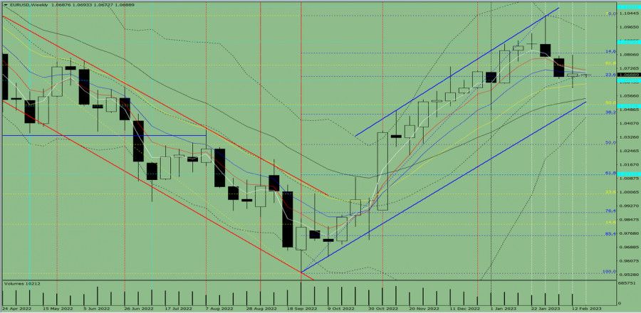 Технический анализ на неделю, с 20 по 25 февраля, валютная пара EUR/USDИнстаФорекс - Instaforex, 2 года назад Трендовый анализ (рис. 1). На этой неделе рынок от уровня 1.0693 (закрытие последней недельной свечи) может продолжить движение вверх с целью 1.0879 – исторический уровень сопротивления (голубая пунктирная линия). По достижении этой линии возможна работа вверх. Рис. 1 (недельный график). Комплексный анализ: - индикаторный анализ – вверх; Вывод по комплексному анализу: восходящее движение. Общий итог расчёта свечи валютной пары EUR/USD по недельному графику: цена на неделе, вероятней всего, будет иметь восходящую тенденцию с отсутствием первой нижней тени у недельной белой свечи (понедельник – вверх) и наличием второй верхней тени (пятница – вниз). На этой неделе рынок от уровня 1.0693 (закрытие последней недельной свечи) может продолжить движение вверх с целью 1.0879 – исторический уровень сопротивления (голубая пунктирная линия). По достижении этой линии возможна работа вверх. Альтернативный сценарий: пара от уровня 1.0693 (закрытие последней недельной свечи) может начать движение вверх с целью 1.0745 – откатный уровень 61,8% (жёлтая пунктирная линия). По достижении этой линии возможно начало работы вниз. Материал предоставлен компанией InstaForex - www.instaforex.com |