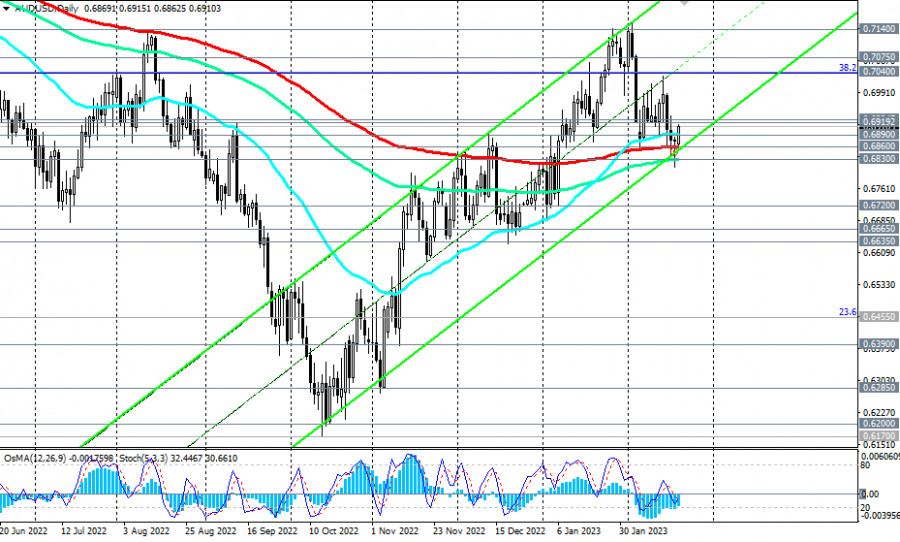 AUD/USD: сценарии динамики на 20.02.2023ИнстаФорекс - Instaforex, 2 года назад Как мы отметили в нашем сегодняшнем обзоре «AUD/USD: краткие итоги и ближайшие перспективы», на фоне ослабления американского доллара, сегодня пара AUD/USD растет после снижения на прошлой неделе. Оттолкнувшись от сегодняшнего минимума 0.6863 и важного среднесрочного уровня поддержки (ЕМА200 на дневном графике), AUD/USD укрепляется в сторону важных краткосрочных уровней сопротивления 0.6919 (ЕМА200 на 1-часовом графике), 0.6924 (ЕМА200 на 4-часовом графике). Их пробой усилит потенциал роста пары в сторону ключевых долгосрочных уровней сопротивления 0.7075 (ЕМА144 на недельном графике), 0.7140 (ЕМА200 на недельном графике), ниже которых AUD/USD остается в зоне долгосрочного медвежьего рынка. В альтернативном сценарии первым сигналом для возобновления коротких позиций может стать пробой уровня поддержки 0.6860, а подтверждающим – уровня поддержки 0.6830 (ЕМА144 на дневном графике) и локального февральского минимума 0.6812. Дальнейшее снижение будет говорить о возврате AUD/USD в долгосрочный нисходящий тренд. *) о событиях недели см. в Важнейшие экономические события недели 20.02.2023 – 26.02.2023 **) об особенностях торговли парой AUD/USD см. в статье AUD/USD: валютная пара (характеристики, рекомендации) Уровни поддержки: 0.6900, 0.6860, 0.6830, 0.6800, 0.6720, 0.6700, 0.6665, 0.6635 Уровни сопротивления: 0.6919, 0.6924, 0.7000, 0.7040, 0.7075, 0.7100, 0.7140