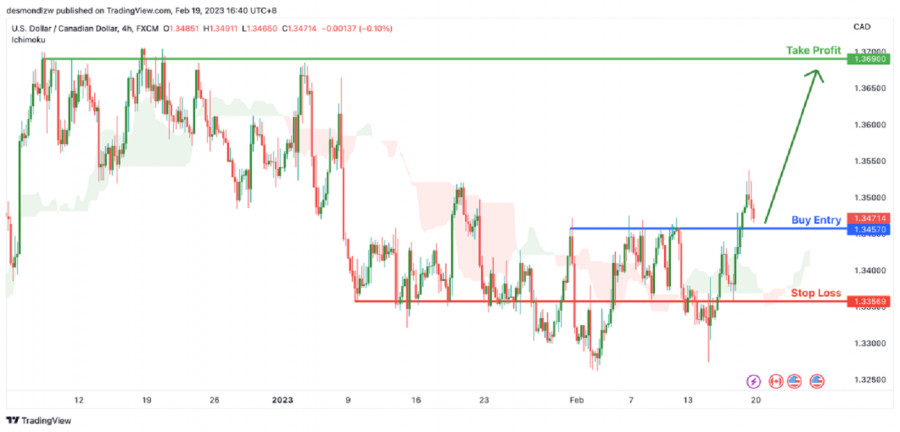 USD/CAD: ожидается рост до ключевого уровня сопротивления. Прогноз на 20 февраля 2023ИнстаФорекс - Instaforex, 2 года назад На 4-часовом графике пара USD/CAD торгуется с бычьим уклоном. В настоящее время цена находится выше облака Ишимоку. Ожидается, что цена пойдет вниз, чтобы повторно протестировать уровень поддержки 1.34570. На этом уровне рекомендуется открывать длинную позицию. Прибыль может быть зафиксирована на уровне 1.36900, где расположен ключевой уровень сопротивления. Стоп-лосс ордер может быть установлен на уровне 1.33569, соответствующем уровню поддержки. Торговая рекомендация Вход: 1.19308 Условия для входа: уровень поддержки Тейк-профит: 11.36900 Условия для фиксации прибыли: ключевой уровень сопротивления Стоп-лосс: 1.33569 Условия для активации ордера стоп-лосс: уровень поддержки Материал предоставлен компанией InstaForex - www.instaforex.com |