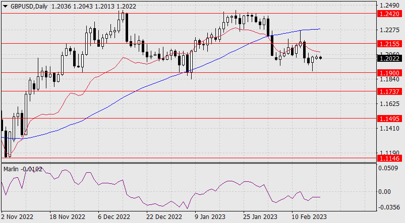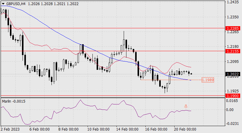 Прогноз по GBP/USD на 21 февраля 2023 годаИнстаФорекс - Instaforex, 2 года назад Понедельник фунт стерлингов закрыл день на уровне закрытия пятницы. Сегодняшнее утро проходит в легком негативном настроении. Осциллятор Марлин дневного масштаба разворачивается вниз, причём на отрицательной территории. Цель 1.1900 становится более ощутимой. Преодоление уровня откроет цель 1.1737 (вершина 13 сентября 2022 года). Развитие цены под индикаторными линиями баланса и Крузенштерна удерживают понижающийся сценарий в качестве основного. Сигнальная линия осциллятора Марлин разворачивается от нулевой линии вниз. По всей видимости, цена собирается атаковать поддержку линии Крузенштерна (1.1989), совпадающей с минимумом 15 февраля. Успех такого намерения позволит цене продолжить снижение к целевой поддержке 1.1900. |
