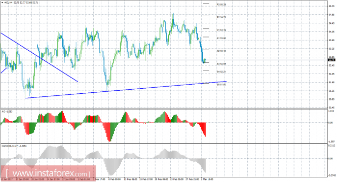Технический анализ сырой нефти за 3 марта 2017 годаИнстаФорекс - Instaforex, 8 лет назад 4-часовой таймфрейм Анализ: Анализ сырой нефти за 2 марта показывает, что цена продолжает усилившееся коррекционное движение и отработала уровень S3. Целями для восходящего движения сейчас являются уровни S2 – 53,19 и S1 – 53,80, если цена отскочит от 52,59. Целями для продолжения нисходящей коррекции выступают уровни 52,21 и 51,60, если цена преодолеет 52,59. Восходящая линия тренда перестроена и теперь вновь оказывает поддержку торгующим на повышение. Однако угол ее наклона минимальный, что подразумевает возможные глубокие коррекции. Индикатор Awesome показывает текущее нисходящее движение, так как последний закрытый бар красного цвета. OsMA также направлен вниз, что говорит о нисходящем характере движения и в среднесрочном плане. Отскок цены от 52,59 может засвидетельствовать окончание коррекции. Торговые рекомендации: Из проведенного анализа движения цены на нефть можно сделать вывод, что сейчас можно рассматривать ордера на покупку с целями 53,19 и 53,80. Стоп лосс выставляем ниже ближайшего уровня поддержки. При заходе сделки в прибыльность 100-150 пунктов, рекомендуется переносить открытую сделку в безубыток. Если цена отскочит от 52,59, это укажет на возобновление движения вверх, как и разворот вверх Awesome или OsMA. Шорты на данный момент не актуальны. Помимо технической картины следует также учитывать фундаментальные данные и время их выхода. Пояснения к иллюстрации: Awesome Oscillator – красные и зеленые бары в окне индикаторов. OsMA – серые бары в окне индикаторов. Линии тренда – синие линии. Уровни поддержки и сопротивления – красные горизонтальные линии.Материал предоставлен компанией InstaForex - www.instaforex.com |