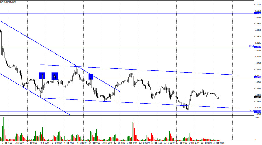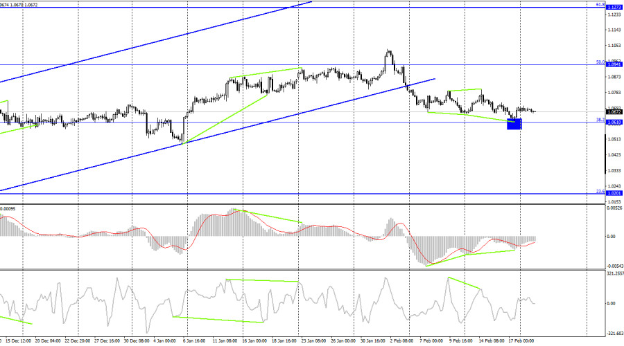 EUR/USD. 21 февраля. Деловая активность в производстве продолжает падать в ЕСИнстаФорекс - Instaforex, 2 года назад Добрый день, уважаемые трейдеры! Пара EUR/USD в понедельник весь день торговалась горизонтально. Сегодня был выполнен разворот в пользу американской валюты и было возобновлено падение в направлении уровня коррекции 161,8%, 1,0614. Падение может продолжаться недолго, но все же должно продолжаться во времени, так как нисходящий трендовый коридор характеризует настроение трейдеров как «медвежье». Отбой курса пары от уровня 161,8%, 1,0614, сработает в пользу валюты ЕС и некоторого роста в направлении верхней линии коридора. Сегодня утром в Евросоюзе и отдельно Германии вышли данные по деловой активности. Если не заострять внимание на каждом отдельно взятом индексе, то можно сказать следующее: в секторах производства зафиксировано очередное снижение и оба остались ниже уровня 50,0. В секторах услуг зафиксирован рост и оба остались выше уровня 50,0. Таким образом, негативные индексы в сферах производства перекрылись индексами в сферах услуг. Поэтому я не жду сегодня сильного падения евровалюты, хотя бы до выхода через несколько часов индексов деловой активности в Америке. Если проанализировать сами отчеты, которые уже вышли, то никаких особенных выводов по ним сделать нельзя. Деловая активность в Европе остается около 50,0 (чуть ниже, чуть выше). На основании этих данных нельзя сделать вывод, что инфляция начнет расти или ВВП падать. А сейчас именно эти данные являются наиболее важными. Индексы деловой активности могли повлиять на настроение трейдеров сегодня, но не более, а по итогу – никак не повлияли. И в течение текущей недели практически все отчеты будут такими. К примеру, отчет по ВВП в США в четвертом квартале. Важный отчет? Да! Но вторая или третья оценка редко отличаются от первой. Даже если отличие и будет, то трейдеры могут проигнорировать отчет, потому что более важны первая и третья оценки. То же самое касается отчета по инфляции в Евросоюзе. Это будет вторая оценка, которая может ничем не отличаться от первой. Таким образом, в течение текущей недели я не жду сильных движений. На 4-часовом графике пара выполнила закрепление под восходящим трендовым коридором. Я считаю этот момент очень важным, так как пара покинула коридор, в котором находилась с октября. Настроение трейдеров теперь характеризуется, как «медвежье», что открывает отличные перспективы роста для американской валюты с целями 1,0610 и 1,0201. Однако «бычья» дивергенция у индикатора MACD позволяет рассчитывать на некоторый рост. Как и отбой от уровня 1,0610. Эти два сигнала могут остановить падение пары на неопределенный срок. Отчет Commitments of Traders (COT):