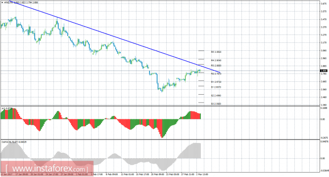 Технический анализ природного газа за 3 марта 2017 годаИнстаФорекс - Instaforex, 8 лет назад 4-часовой таймфрейм Анализ: Анализ природного газа за 3 марта показывает, что цена продолжает корректироваться с целью нисходящая линия тренда. На данный момент актуально нисходящее движение с целями уровни поддержки R1 – 2,6730 и S1 – 2,6070, если цена закрепится ниже 2,7810. Целью для продолжения восходящей коррекции выступает линия тренда, если цена останется выше 2,7810. Нисходящая линия тренда перестроена и поддерживает торгующих на понижение, а также делает актуальными короткие позиции. Если цена уйдет выше нее, это изменит текущую тенденцию на восходящую и станут актуальными ордера на покупку. Индикатор Awesome показывает локальное нисходящее движение, последний закрытый бар окрашен в красный цвет. OsMA также развернулся вниз, что сигнализирует о нисходящем движении цены на газ и в более долгосрочном плане. Оба индикатора с высокой долей вероятности разряжаются. Отскок цены от линии тренда может засвидетельствовать окончание коррекции. Торговые рекомендации: По инструменту #NG сейчас рекомендуется рассматривать варианты шортов с целями 2,6730 и 2,6070. Стоп лосс выставляется выше ближайшего уровня сопротивления. Рекомендуется выставить стоп лосс в зону безубытка при прибыльности сделки 800-1000 пунктов. Если цена отскочит от линии тренда или закрепится ниже 2,7810, это засвидетельствует окончание коррекции. Длинные позиции пока не актуальны. Помимо технической картины следует также учитывать фундаментальные данные и время их выхода. Пояснения к иллюстрации: Awesome Oscillator – красные и зеленые бары в окне индикаторов. OsMA – серые бары в окне индикаторов. Линии тренда – синие линии. Уровни поддержки и сопротивления – красные горизонтальные линии.Материал предоставлен компанией InstaForex - www.instaforex.com |
