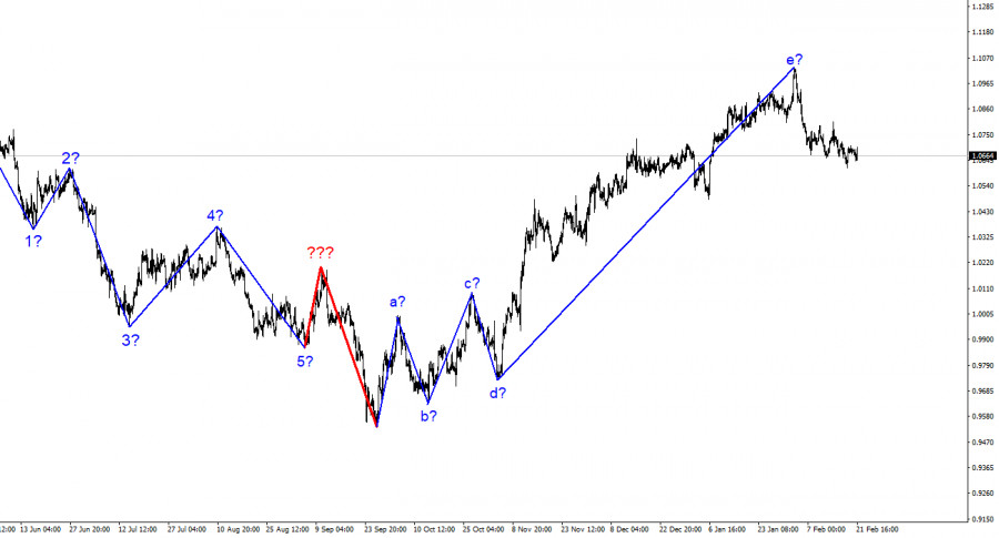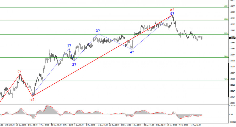 Анализ EUR/USD. 21 февраля. Евровалюту от падения уберегает новостной фон.ИнстаФорекс - Instaforex, 2 года назад Волновая разметка 4-часового графика для инструмента Евро/Доллар абсолютно не меняется в последнее время, что очень хорошо, так как мы понимаем, как может развиваться ситуация. Повышательный участок тренда принял ярко выраженный коррекционный(хотя его размер больше подходит для импульсного участка) вид. Мы получили структуру волн a-b-c-d-e, в которой волна e имеет гораздо более сложный вид, чем первые четыре волны. Если текущая волновая разметка верна, то построение этой структуры завершено, а волна e получилась гораздо протяженнее всех предыдущих волн. Нас ожидает построение минимум трех волн вниз, поэтому я по-прежнему ожидаю сильного снижения инструмента. В первые недели 2023 года спрос на евровалюту оставался стабильно высоким, а инструмент за этот период времени сумел один раз лишь немного отойти вниз от ранее достигнутых пиков. Однако в начале февраля американская валюта сумела выйти из-под давления рынка, и текущий отход котировок от достигнутых пиков может считаться началом нового понижательного участка тренда, которого я откровенно заждался. Хочется верить, что на этот раз новостной фон и настроение рынка не помешают построению нисходящего набора волн. Спрос на евровалюту продолжает потихоньку снижаться, но очень медленно.Инструмент Евро/Доллар во вторник вновь двигался с невысокой амплитудой, хотя несколько интересных всплесков активности все же было. Сегодня новостной фон был кое-какой, и хоть мне и сложно назвать его важным для рынка, все же он не остался незамеченным. Какого-либо определенного направления сегодня рынок не выбрал, но все же нисходящий настрой сохраняется. Так как отхода котировок от достигнутых лоу пока нет, то первая волна нового понижательного участка тренда продолжает свое построение. Чем сильнее получится эта волна, тем сильнее получится предполагаемая третья волна(или с). Таким образом, чем дольше падает евровалюта сейчас, тем ниже она может упасть в будущем. Исходя из текущей волновой разметки, я полностью поддерживаю сценарий с дальнейшим снижением инструмента. Сегодня утром в Германии вышли отчеты по деловой активности. В секторе услуг деловая активность выросла до 51,3 пунктов, в секторе производства упала до 46,5 пунктов, а композитный индекс вырос до 51,1. Так как не все три индекса соответствовали ожиданиям рынка, то евровалюта не получила повышенный спрос. В Евросоюзе вышли такие же индексы. В секторе производства индекс снизился до 48,5, в секторе услуг – вырос до 53,0, а в композитный индекс вырос до 52,3. То есть динамика индексов была одинаковой в ЕС и Германии. Слабым оказался только промышленный сектор. Как следствие, спрос на евровалюту в течение дня то снижался, то повышался и на момент написания статьи снижение составляет около 30 базисных пунктов. Нисходящая волна, таким образом, продолжает собственное построение и пока нет причин ожидать ее завершение. Я предполагаю, что она может завершиться около 5 фигуры. Общие выводы.Исходя из проведенного анализа, я делаю вывод, что построение восходящего участка тренда завершено. Таким образом, сейчас можно рассматривать продажи с целями, расположенными около расчетной отметки 1,0350, что соответствует 261,8% по Фибоначчи. Вероятность еще большего 