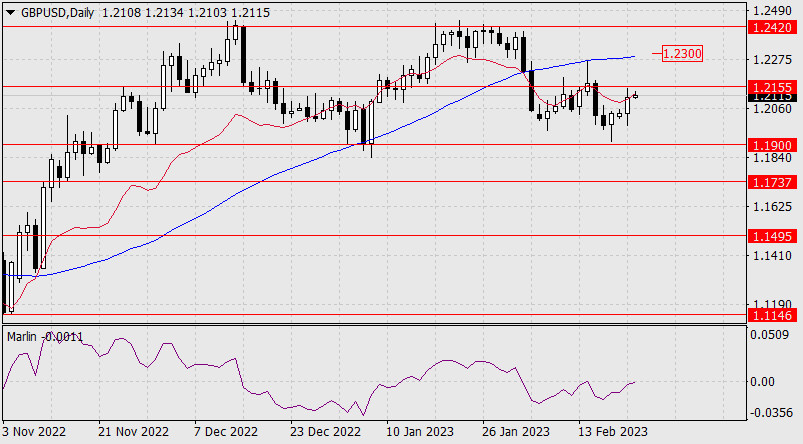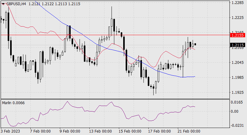 Прогноз по GBP/USD на 22 февраля 2023 годаИнстаФорекс - Instaforex, 2 года назад Вчера фунт стерлингов стал безусловным лидером валютного рынка, показав рост на 0,59% (70 пунктов) на фоне роста индекса доллара на 0,31%. Так фунт отреагировал на оптимистичные данные по деловой активности; Manufacturing PMI в февральской оценке возрос с 47,0 до 49,2, Services PMI составил 53,3 против 48,7 месяцем ранее. Оба индикатора вышли лучше ожиданий. Если до конца недели американские статистические данные не изменят настроения «быков» по британскому фунту, то рост может продолжиться до индикаторной линии Крузенштерна дневного масштаба, в район 1.2300. Но для начала нужно закрепиться над ближайшим сопротивлением 1.2155. Осциллятор Марлин уже в положительной области, вероятность успеха (в преодолении 1.2155) 65%.