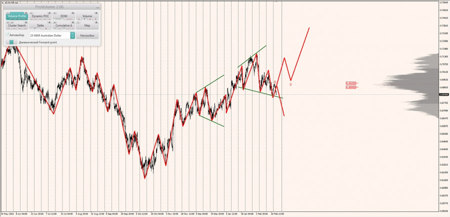 Долгосрочная тенденция: в шорт. Максимальное скопление объемов текущего контракта расположено в диапазоне, по котировкам 0.68950-0.69250. В настоящий момент по паре совершаются инвестиционные операции ниже, указывая на силу продавцов.