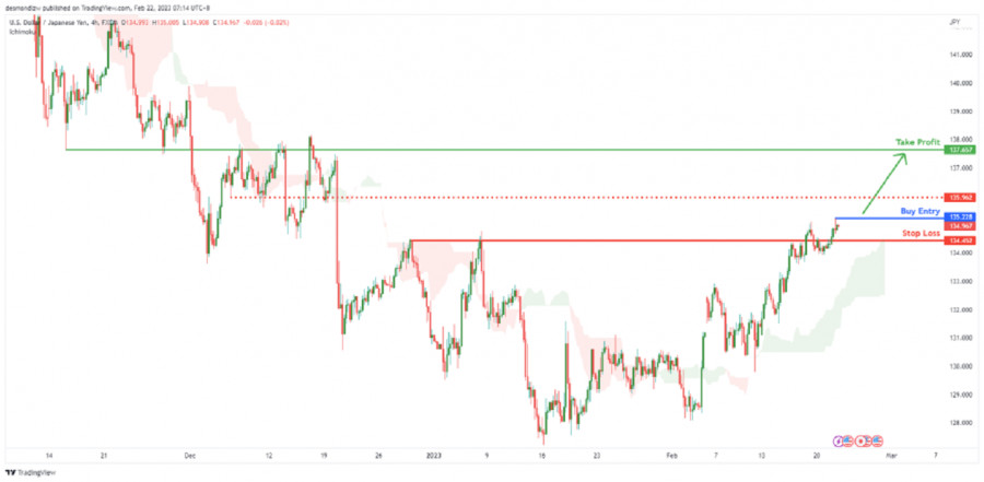 USD/JPY торгуется под контролем быков. Прогноз на 22 февраля 2023 г.ИнстаФорекс - Instaforex, 2 года назад На 4-часовом графике пара USD/JPY торгуется в бычьем тренде. В настоящее время цена находится выше облака Ишимоку. Рекомендуется покупать на уровне 135.228, чтобы использовать бычий импульс. Стоп-лосс ордер может быть установлен на уровне поддержки 134.452. Стоит отметить, что промежуточное сопротивление на уровне 135.962 может выступить препятствием. Прибыль может быть зафиксирована на уровне 137.657, где расположен предыдущий уровень свинг-хай. Торговая рекомендация Вход: 135.228 Условия для входа: стоп-приказ на покупку, чтобы поймать бычий импульс Тейк-профит: 137.657 Условия для фиксации прибыли: предыдущий уровень свинг-хай Стоп-лосс: 134.452 Условия для активации ордера стоп-лосс: уровень поддержки Материал предоставлен компанией InstaForex - www.instaforex.com |