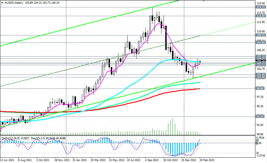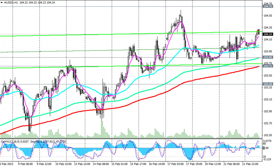Индекс доллара #USDX: сценарии динамики на 22.02.2023ИнстаФорекс - Instaforex, 2 года назад Как мы отметили в нашем сегодняшнем Фундаментальном анализе, доллар и его индекс DXY растут с открытия сегодняшнего торгового дня. Так, на момент публикации данной статьи фьючерсы DXY (CFD #USDX в торговом терминале МТ4) торговались вблизи отметки 104.20, оставаясь при этом в диапазонах между отметками 104.60 и 102.39 и отметками 105.50 и 100.68. Ниже ключевого уровня сопротивления 104.70 (ЕМА200 на дневном графике CFD #USDX) индекс доллара DXY остается в зоне медвежьего рынка. Пробой уровней поддержки 103.85 (ЕМА144 на дневном графике) и 103.71 (ЕМА200 на 1-часвовом графике) может стать сигналом для возобновления коротких позиций по DXY с целями на локальных уровнях поддержки 101.50, 101.00. В случае дальнейшего снижения целями станут ключевые уровни поддержки 100.00 (ЕМА144 на недельном графике) и 98.80 (ЕМА200 на недельном графике). Пробой же долгосрочного уровня поддержки 93.30 (ЕМА200 на месячном графике) подтвердит окончательный возврат доллара и его индекса DXY в зону глобального нисходящего тренда. В альтернативном сценарии и после пробоя уровней сопротивления 104.70 и 105.10 (ЕМА144 на дневном графике) DXY возобновит рост, возвратившись в зону долгосрочного бычьего тренда DXY. А сегодня участники рынка, следящие за котировками доллара, будут ждать публикации (в 19:00 GMT) протоколов с заседания ФРС, завершившегося 01 февраля. * О важных событиях недели см. в Важнейшие экономические события недели 20.02.2023 – 26.02.2023 Уровни поддержки: 104.00, 103.85, 103.71, 103.40, 102.00, 101.50, 101.00, 100.00, 98.80. Уровни сопротивления: 104.70, 105.10, 107.80, 109.25.