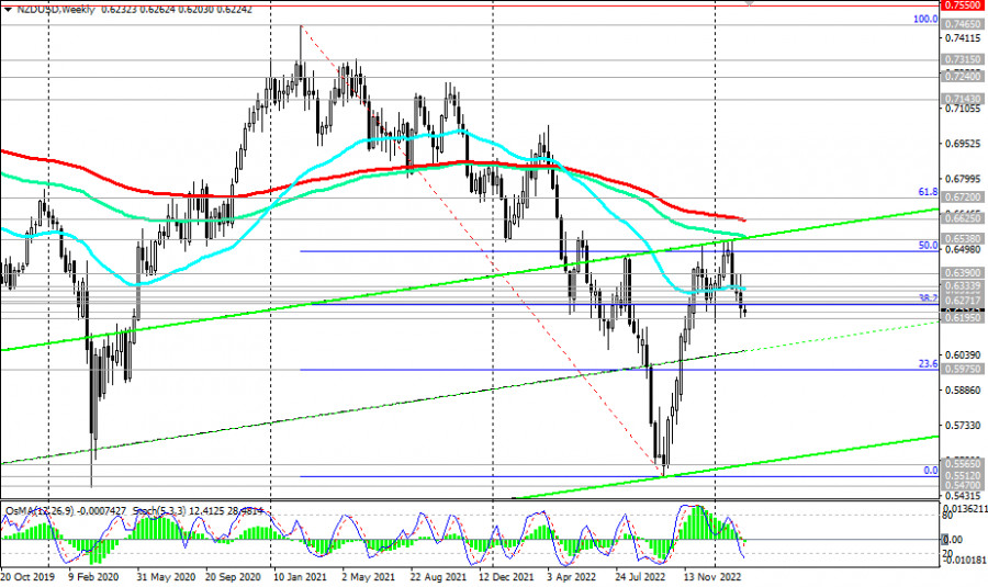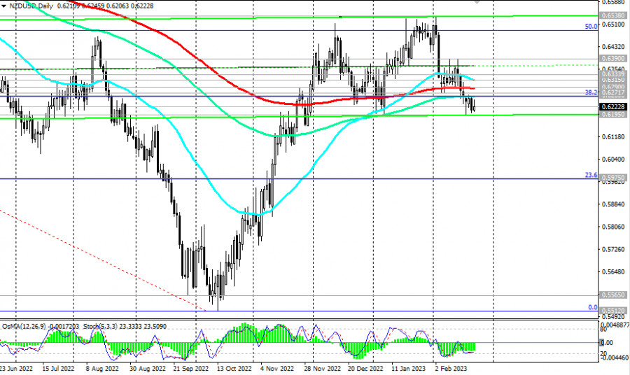 NZD/USD: сценарии динамики на 22.02.2023ИнстаФорекс - Instaforex, 2 года назад Как мы отметили в нашем сегодняшнем «Фундаментальном анализе», сегодня после публикации РБНЗ о решении повысить в очередной раз процентную ставку новозеландский доллар укрепился, а пара NZD/USD подскочила к внутридневному максимуму 0.6245, но затем вновь перешла к снижению. На момент публикации данной статьи она торговалась вблизи отметки 0.6225, оставаясь в зоне медвежьего рынка, что делает короткие позиции предпочтительными. Вероятно, пробой локального уровня поддержки 0.6195 станет сигналом для их наращивания, а NZD/USD направится в сторону локального (с марта 2020 года) минимума 0.5512. Технические индикаторы OsMA и Стохастик на дневном и недельном графиках также находятся на стороне продавцов. В альтернативном сценарии сигналом для возобновления длинных позиций станет рост в зону выше ключевого уровня сопротивления 0.6290 (ЕМА200 на дневном графике). Первым сигналом для этого движения может стать пробой важного уровня сопротивления 0.6260 (ЕМА144 на дневном графике и уровень Фибоначчи 38,2% в недавней волне снижения пары с отметки 0.7465 в феврале 2012 года к отметке 0.5512, достигнутой в октябре 2022 года) и краткосрочного уровня сопротивления 0.6272 (ЕМА200 на 1-часовом графике). * Об особенностях торговли NZD см. в статьях