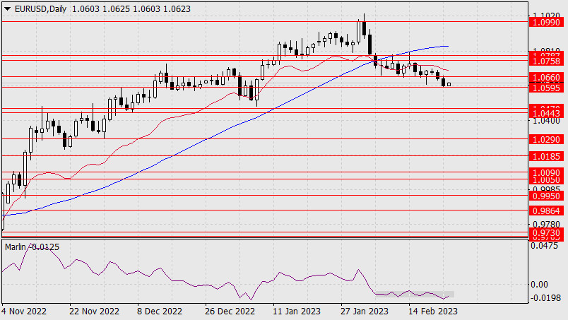 Прогноз по EUR/USD на 23 февраля 2023 годаИнстаФорекс - Instaforex, 2 года назад В среду евро не стал преподносить сюрприза и продвинулся вниз к целевому уровню 1.0595 на 43 пункта, не дотянув до него всего 4 пункта. Цена закрепилась в диапазоне консолидации 16-29 декабря прошлого года из которого, следуя идеи основного сценария, выйдет достаточно быстро и вниз, так как сигнальная линия осциллятора Марлин уже вышла из своей консолидации также вниз. Теперь мы ждём закрепления цены под 1.0595 и отработку целевого диапазона 1.0443/70 (минимум апреля 2022 года – минимум 17 декабря).