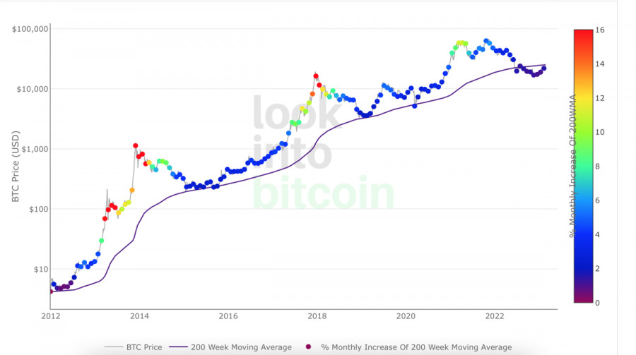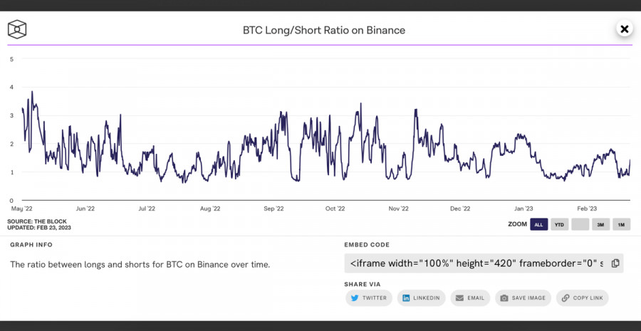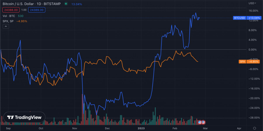 Bitcoin продолжает консолидационное движение вблизи $24,5k: когда ждать возобновление роста?ИнстаФорекс - Instaforex, 2 года назад Последние дни Биткоин перешел к стадии консолидационного движения, вследствие неудачного ретеста области $25k-$25,2k. Сопротивление продавцов выше важного уровня оказалось настолько мощным, что повторные ретесты области не принесли желаемых результатов. Под давлением продавцов Биткоин начал снижаться в рамках ценовой области $24k-$24,8k. Пока покупатели удерживают этот рубеж, бычий тренд криптовалюты остается нетронутым, и можно рассчитывать на возобновление попыток пробиться выше $25k. Вблизи уровня $25,1k проходит 200 WMA, преодоление которой может открыть криптовалюте путь к $30k. Последний раз цена находилась выше данной метрики перед крахом LUNA/UST. Для реализации паттерна цене BTC необходимо завершить две торговые недели выше уровня $25,1k. Однако вероятность успешной реализации данного паттерна вызывает вопросы, учитывая нарастающий скепсис на смежных рынках. Настроения инвесторов в среднесрочной перспективе выглядят неоднозначными, а после публикации "минуток" от ФРС могут приобрести медвежьи оттенки. Макроэкономические факторыИз публикации отчетности ФРС следует, что ведомство считает текущий уровень инфляции высоким, а темпы дефляционного движения за последние три месяца – недостаточными. Исходя из этого, регулятор продолжит следовать своей монетарной политике и сокращать балансы. Некоторые члены ФРС заявили о необходимости повышения ключевой ставки на 0,50%. При этом все чиновники согласны с повышением ставки на 0,25% в феврале. Также ведомство обеспокоено сильным рынком труда и растущей неопределенностью касательно экономики США в 2023 году. ФРС ужесточила свое мнение касательно текущей ситуации, и не исключено, что в ближайшем будущем будет рассмотрен вопрос о повышении ставки на 50 б.п. или как минимум продлении агрессивной политики. В случае сохранения сильных показателей рынка труда вероятность повышения ставки на 0,50% возрастет. Тучи продолжают сгущаться над фондовым рынком и конкретно индексом S&P 500. По заявлениям аналитиков Morgan Stanley, в ближайшие месяцы цена SPX может рухнуть до $3000, что эквивалентно 25% снижению цены. По состоянию на 23 февраля актив совершил медвежий пробой уровня $4000. Анализ BTC/USDНесмотря на высокий уровень корреляции между BTC и SPX, есть основания полагать, что криптовалюте удастся отвязаться от фондового индекса. Согласно данным Glassnode, за последние месяцы наблюдается динамика роста числа адресов с минимум 1 BTC на балансе. Кроме того не стоит забывать, что продолжается консолидационное движение в рамках области $24,1k-$24,8k. Последний раз локальный период накопления способствовал бычьему пробою и закреплению BTC выше $24k. Согласно данным Coinglass, по состоянию на 23 февраля на рынке Биткоина преобладают медвежьи настроения. Если ситуация кардинально не переменится за ближайшие дни, то BTC продолжит восходящее движение благодаря большим объемам коротких позиций. На дневном графике BTC мы видим классическую консолидацию криптовалюты. Активу не удалось закрепиться выше $25k после серии ретестов, вследствие чего цена отправилась к нижней границе диапазона. На текущем этапе быкам явно не хватает объемов для того, чтобы окончательно перехватить инициативу. Покупателям удается откупить большую часть медвеж