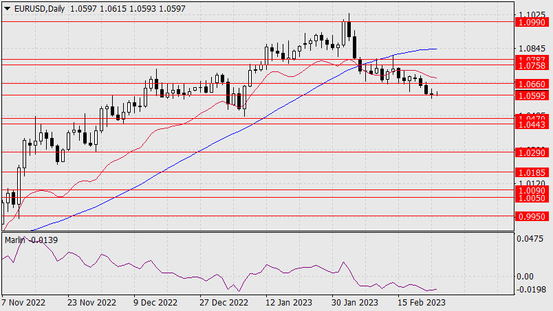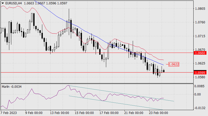 Прогноз по EUR/USD на 24 февраля 2023 годаИнстаФорекс - Instaforex, 2 года назад В четверг евро показал небольшую волатильность, не в силах оторваться от целевого уровня 1.0595. Сегодня утром котировка также колеблется возле данного уровня, но осциллятор Марлин начал разворот вверх, поэтому может быть коррекция до сопротивления 1.0660. Если цена найдёт в себе силы закрепиться под 1.0595, то со следующей недели ждём поход до целевого уровня 1.0443/70.