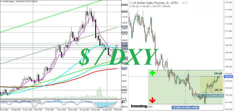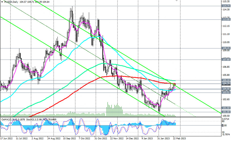 Доллар: краткие итоги и ближайшие перспективыИнстаФорекс - Instaforex, 2 года назад Получив вчера дополнительную поддержку от позитивной макро статистики, поступившей из США, доллар продолжает наступать на рынке. Если ожидаемые сегодня данные по личным доходам/расходам американцев также окажутся позитивными, то индекс доллара DXY завершит эту неделю на позитивной территории, с приростом, как минимум в 0,5%. И это будет уже 4-я подряд неделя, оказавшаяся удачной для доллара. Всего же за истекший месяц (эта неделя является последней полной торговой неделей февраля. Следующая будет переходной между февралём и мартом) индекс доллара DXY прибавил (на текущий момент) 2,7%, почти в 2 раза перекрыв потери предыдущего месяца. На момент публикации данной статьи фьючерсы DXY торговались вблизи отметки 104.62, предпринимая повторную попытку пробоя верхней границы диапазона, сформировавшегося между отметками 104.60 и 102.39. Как мы отметили в наших предыдущих обзорах Доллар: краткие итоги и ближайшие перспективы, и Индекс доллара #USDX: сценарии динамики на 22.02.2023, «если начавшаяся в феврале восходящая коррекция DXY продолжится, то пробой уровней сопротивления 104.60, 105.50 спровоцирует дальнейшее укрепление доллара и рост DXY». Из новостей же на сегодня, стоит обратить внимание на публикацию (в 13:30 GMT) блока важной макро статистики из США, среди которой – данные по личным доходам/расходам американцев, базовый индекс цен PCE (без волатильных цен на продукты питания и энергоносители), основной показатель инфляции, который чиновники FOMC ФРС используют в качестве основного индикатора инфляции, уточенный индекс потребительского доверия Мичиганского университета (финальный релиз), который является опережающим индикатором потребительских расходов, на которые, в свою очередь, приходится большая часть общей экономической активности. Он также отражает уверенность американских потребителей в экономическом развитии страны (подробнее см. в Важнейшие экономические события недели 20.02.2023 – 26.02.2023). Позитивные данные отчетов и показатели выше прогнозных значений окажут новую поддержку доллару. Если эти данные разочаруют инвесторов, то следует ожидать фиксации части длинных позиций по доллару в конце недели, что вызовет его ослабление. Пробой уровней поддержки 103.95 (ЕМА50 на дневном графике), 104.00 (ЕМА200 на 1-часовом графике) может стать сигналом для возобновления коротких позиций по DXY (CFD #USDX в торговом терминале МТ4) с целями на локальных уровнях поддержки 101.50, 101.00. В случае дальнейшего снижения целями станут ключевые уровни поддержки 100.00 (ЕМА144 на недельном графике), 98.80 (ЕМА200 на недельном графике). Пробой же долгосрочного уровня поддержки 93.30 (ЕМА200 на месячном графике) подтвердит окончательный возврат доллара и его индекса DXY в зону глобального нисходящего тренда. В основном же сценарии, возможно даже после краткосрочной нисходящей коррекции, и после пробоя ключевых уровней сопротивления 104.70 (ЕМА200 на дневном графике), 105.10 (ЕМА144 на дневном графике) ждем дальнейшего укрепления доллара и роста DXY. *) о важных событиях предстоящей недели см. в Важнейшие экономические события недели 27.02.2023 – 05.03.2023 Уровни поддержки: 104.00, 103.95, 103.00, 102.00, 101.50, 101.00, 100.00, 98.80 Уровни сопротивления: 104.70, 105.10, 107.80, 109.25