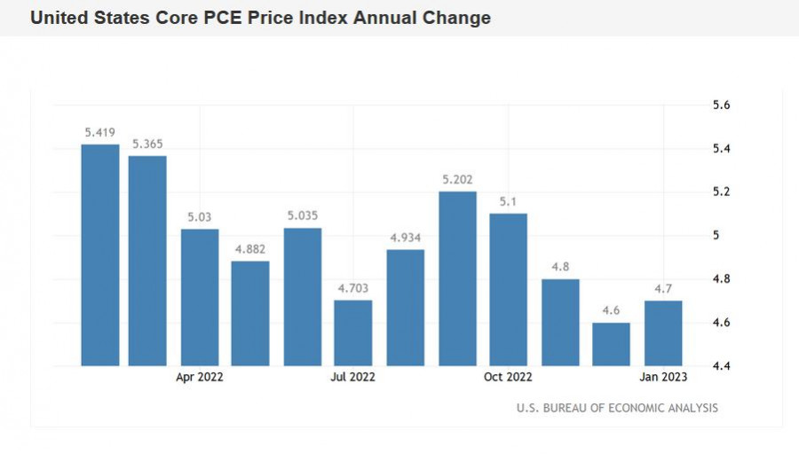 EUR/USD. Доллар снова на коне: базовая инфляция PCE выросла до 4,7%ИнстаФорекс - Instaforex, 2 года назад Пара евро-доллар сегодня обновила 7-недельный ценовой минимум, закрепившись в рамках 5-й фигуры. На волне долларового ралли продавцы eur/usd протестировали важный уровень поддержки 1,0550 (нижняя линия индикатора Bollinger Bands на дневном графике). Такая ценовая динамика носит вполне оправданный характер: очередной инфляционный релиз отразил замедление темпов снижения инфляции в США. В «зелёной зоне» вышел важнейший для ФРС инфляционный индикатор – базовый индекс PCE. По большому счёту, это был последний пазл, который образовал общую картину. Инфляция в Штатах снова начала поднимать голову, вынуждая ФРС принимать ответные меры. Тревоги Пауэлла оправдались Ещё в начале февраля глава Федрезерва Джером Пауэлл обеспокоился темпами снижения инфляции. Хотя на тот момент об этом сигнализировали лишь косвенные инфляционные индикаторы. «Магистральные» индексы (ИПЦ, ИЦП, PCE) отражали нисходящую тенденцию. Тем не менее, выступая на конференции в Экономическом клубе Вашингтона, Пауэлл недвусмысленно дал понять, что Федрезерв, во-первых, продолжит повышать ставку, «которая пока не достигла приемлемого для борьбы с инфляцией уровня» (при это он не уточнил, какой же уровень ставки является «приемлемым»), а во-вторых, будет удерживать политику на ограничительном уровне «столько, сколько потребуется». При этом он тогда признал, что в некоторых секторах экономики США начался дезинфляционный процесс. Но рынок проигнорировал эту ремарку, акцентировав своё внимание на ястребиные тезисы. Например, Пауэлл заявил, что темпы инфляции могут замедлиться до целевого уровня только лишь в 2024 году. Уже в середине февраля стало ясно, что Джером Пауэлл не зря выражал свою обеспокоенность. Опубликованные инфляционные отчёты отразили замедление темпов снижения инфляции. Индекс потребительских цен и индекс цен производителей оказались в «зелёной зоне», удивив многих экспертов и участников рынка. Для полноты картины необходим был ещё один релиз, который подтвердил бы (или наоборот – подверг сомнению) сложившуюся тенденцию. Речь идёт об основном индексе расходов на личное потребление (PCE), который был опубликован сегодня. Это важнейший инфляционный индикатор, который отслеживается членами Федрезерва, как говорится, «с особым пристрастием». Пазл сложился Решающий отчёт оказался на стороне долларовых быков. Индекс PCE не только оказался в «зелёной зоне», но и возобновил свой рост после трёхмесячного последовательного спада (в годовом исчислении). Так, в сентябре 2022 года показатель достиг своего пика, обозначившись на отметке 5,2%. Затем, на фоне агрессивных действий ФРС, индекс начал сползать вниз, достигнув в декабре отметки 4,6%. И по прогнозам большинства экспертов, в январе этот показатель должен был опуститься ещё на одну ступень ниже – на отметку 4,2%. Но вопреки ожиданиям, индекс PCE поднялся до 4,7% (г/г). В месячном выражении индикатор также вышел в «зелёной зоне», поднявшись до 0,6% (максимальный темп роста с июня прошлого года). Повторюсь – годовой базовый индекс цен PCE является предпочтительным показателем инфляции для Федеральной резервной системы. Даже «изолированный» рост этого индикатора способен оказать поддержку американской валюте. Тогда как на данный момент можно у