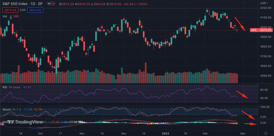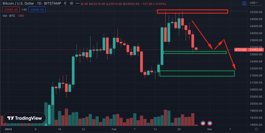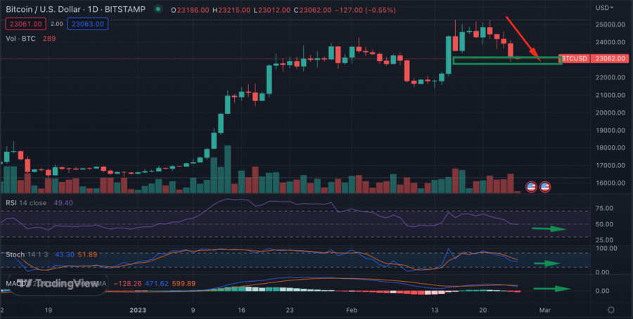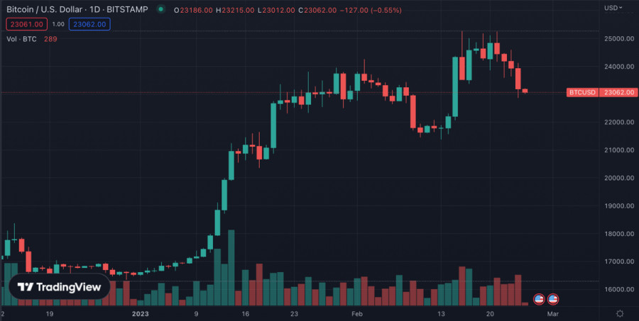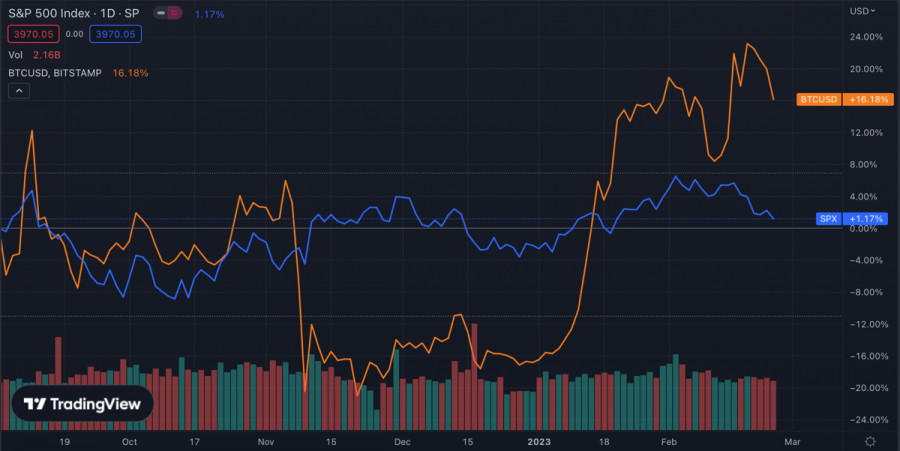 Bitcoin снижается к $23k на фоне падения котировок SPX: что ждет криптовалюту дальше?ИнстаФорекс - Instaforex, 2 года назад Биткоин несколько дней консолидировался вблизи уровня $24k и не давал медведям продавить цену ниже данного уровня. При этом рыночные настроения оставались скептическими, а объемы коротких позиций превалировали над длинными. Параллельно индекс SPX приближался к медвежьему пробою ключевого уровня поддержки $4000. Впоследствии актив совершит пробой данной отметки и потянет за собой как фондовый рынок, так и криптовалютный. Также важно отметить, что этот процесс будет сопровождаться нарастанием макроэкономической напряженности. Фундаментальные факторыПрогнозы ведущих банков мира начинаются сбываться, и фондовый показатель SPX начинает коррекционное движение. Потенциальное дно рынка аналитики видят вблизи уровня $3000, что может свидетельствовать о мощном нисходящем движении в ближайшие месяцы. Среди ключевых факторов падения индекса SPX и Биткоина нужно выделить политику ФРС. CNBC отмечает, что казначейские облигации США становятся привлекательнее акций из-за растущей доходности. Подобная ситуация уже складывалась летом, когда ФРС укреплял доллар США, который более чем на 50% обеспечен казначейскими облигациями. Еще одной вероятной причиной падения SPX и Bitcoin могла стать перегретость рынка акций. Согласно исследованию Vanda Research на фондовом рынке отмечается всплеск активности физических лиц и повышенное внимание к мем-акциям, что указывает на растущую жадность рынка. Помимо этого рыночные игроки ожидают увидеть финальный показатель ключевой ставки выше заявленного уровня. СЕО JPMorgan заявил, что ФРС может повысить ставку до 6%, а учитывая сильные макроданные в США, сомнений в более агрессивном повышении ставки все меньше. Напомним, что согласно последним данным, ВВП США в IV квартале 2022 года составили 2,7% в годовом исчислении вместо 2,9% по предварительным оценкам. Учитывая кризисный 2022 года этот показатель можно воспринимать как локальное отклонение от позитивного показателя. Более того, JPMorgan повысил прогноз роста экономики США в 2023 году до +0,4% вместо изначально заявленных +0,1%. Morgan Stanley также заявили, что США могут избежать финансового кризиса, а SPX отыграет все потери к 2024 году. Учитывая все большую интеграцию Биткоина в мировую экономику, этот прогноз касается и криптовалют. Анализ BTC/USDТем временем Биткоин последовал за индексом SPX и достиг локальной зоны поддержки на отметке $23k. За последние 24 часа актив потерял 3% капитализации, а недельное падение составило 6%. BTC достиг сильной зоны поддержки, что не исключает дальнейшего нисходящего движения. Эксперты Santiment сообщают, что кошельки с балансами 1000 - 100 000 BTC начинают активно распродавать свои активы. В то же время Glassnode сообщает, что число адресов с +1 BTC приближается к показателю в один миллион. Также продолжается активное накопление свободных объемов BTC, что подтверждает фундаментальную ценность криптовалюты. По состоянию на 25 февраля Биткоин достиг ключевой зоны поддержки на отметке $23k, где актив консолидировался в конце января и начале февраля. Несмотря на замедление падения, технические метрики не демонстрируют сигналов к вероятному бычьему развороту. Учитывая это, вероятней всего нас ожидает локальная консолидация, которая может сопровождаться попытками медведей прода
