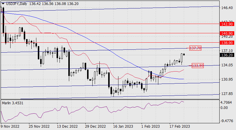 Прогноз по USD/JPY на 27 февраля 2023 годаИнстаФорекс - Instaforex, 2 года назад В пятницу йена со всей убедительностью показала своё намерение отработать целевой уровень 137.70. Преодоление сопротивления данной вложенной линии ценового канала позволит последовательно отрабатывать целевые линейные уровни 138.90, 140.90 и др. Тем не менее, такому блестящему плану мешает осциллятор Марлин, очень нехотя продолжающий рост на дневном масштабе. Перспектива его роста велика, но также велик и потенциал разворота вниз. Весьма вероятно, что прежде выхода цены над 137.70, последует коррекционное снижение к 133.90.