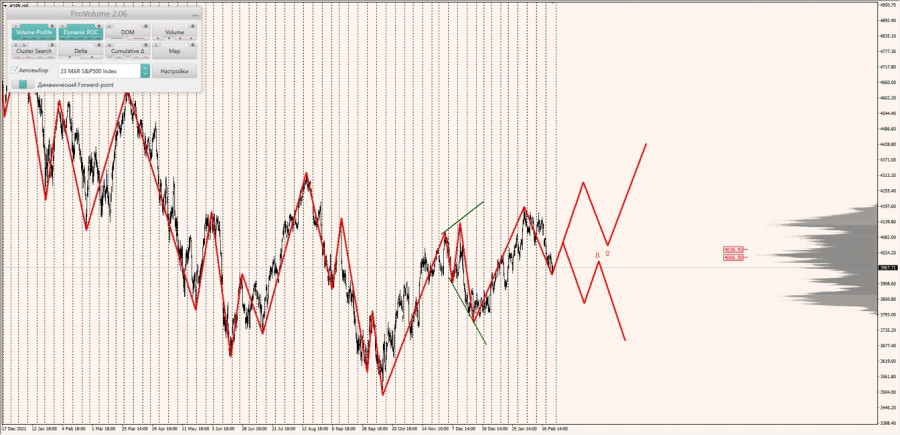 Альтернативный сценарий: при закреплении котировок индекса SNP500 выше зоны 1/2 (4058.25) при откатах искать покупки по паттерну в новом диапазоне выгодных цен, с целями: обновление максимумов и тестирование нижней границы НКЗ (4153.65).