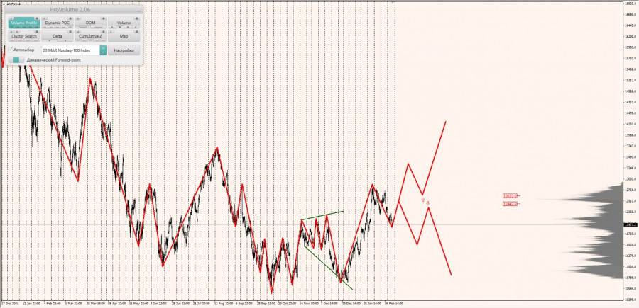 Альтернативный сценарий: при закреплении котировок индекса Nasdaq выше зоны 1/2 (12330.7) при откатах искать покупки по паттерну в новом диапазоне выгодных цен с целями: обновление максимумов и тестирование нижней границы НКЗ (12686.2).