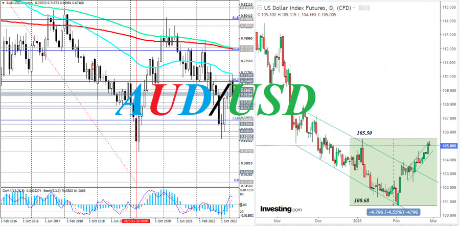 AUD/USD: краткие итоги и ближайшие перспективыИнстаФорекс - Instaforex, 2 года назад Получив поддержку от поступавших из США позитивных макроданных и после завершившегося в начале месяца заседания ФРС, доллар значительно укрепился в феврале. Так, после опубликованных ранее сильных данных с рынка труда доллар смог развить бычий импульс на фоне позитивных отчётов с данными по ВВП США и уровню инфляции. В пятницу укрепление доллара усилилось после того, как Бюро экономического анализа Министерства торговли США представило данные по личным доходам/расходам американцев и опубликовало базовый индекс цен PCE (без волатильных цен на продукты питания и энергоносители), основной показатель инфляции, который чиновники FOMC ФРС используют в качестве основного индикатора инфляции. Данные указали на рост потребительских расходов в начале этого года. При этом уточенный индекс потребительского доверия Мичиганского университета, который является опережающим индикатором потребительских расходов, на которые, в свою очередь, приходится большая часть общей экономической активности, также опубликованный в пятницу, позволил покупателям доллара поставить жирную точку в конце недели. Как сообщили в Мичиганском университете, индекс доверия потребителей США вырос в феврале до значения 67,0 после 64,9, 59,7, 56,8 в предыдущие месяцы, оказавшись также лучше предварительной оценки и прогноза 66,4. Всего же за минувшую неделю индекс доллара DXY прибавил 1,27%, превысив также пресловутую отметку 105.00. Это была 4-я подряд неделя роста доллара и его индекса DXY. Если ожидаемые сегодня (в 13:30 GMT) данные по заказам на товары длительного пользования (и заказам на капитальные товары без учета оборонных и авиационных) также окажутся воодушевляющими, то доллар завершит этот месяц (завтра последний его день) с ощутимым приростом в 3,0%. Заказы на товары длительного пользования подразумевают крупные инвестиции в их производство. Этот опережающий индикатор сигнализирует также о состоянии американской экономики. Растущие заказы на поставку данной категории товаров сигнализируют о том, что производители будут наращивать активность по мере выполнения заказов. А это значит, что будет расти спрос на рабочую силу, на сырье и энергию, заставляя также активизироваться другие важные составляющие в производстве товаров. Предыдущие значения индикатора «заказы на товары длительного пользования»: +5,6% в декабре, -1,7% в ноябре 2022 года, +0,7%, +0,3%, +0,2%, -0,1%, +2,2% в июне, +0,8% в мае, +0,4% в апреле, +0,6% в марте, -1,7% в феврале, +1,6% в январе. Прогноз на январь негативный, подразумевающий сокращение на -4,0%. Если прогноз подтвердится, то бычий импульс доллара может немного иссякнуть под конец месяца, что также даст возможность передышки продавцам доллара. А завтра утром участники рынка, следящие за котировками австралийского доллара, обратят внимание на публикацию в 00:30 (GMT) данных Австралийского бюро статистики по розничным продажам в стране за январь. Ожидается рост показателя до +1,5% после падения в декабре на -3,9%. Индекс уровня розничных продаж - основной показатель потребительских расходов, на которые приходится большая часть общей экономической активности. Он также считается индикатором потребительского доверия и отражает состояние розничного сектора в ближайшей перспективе. Поэтому рост индекса должен оказат