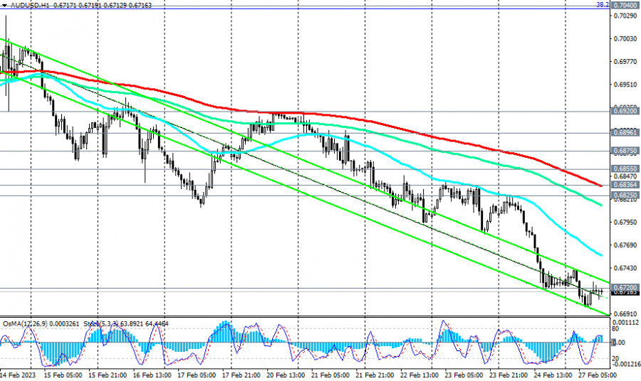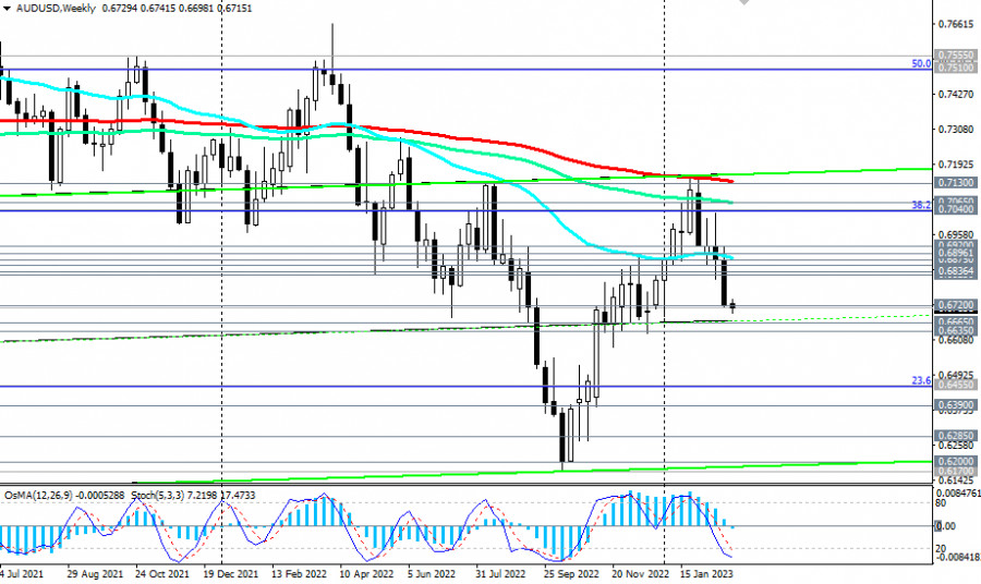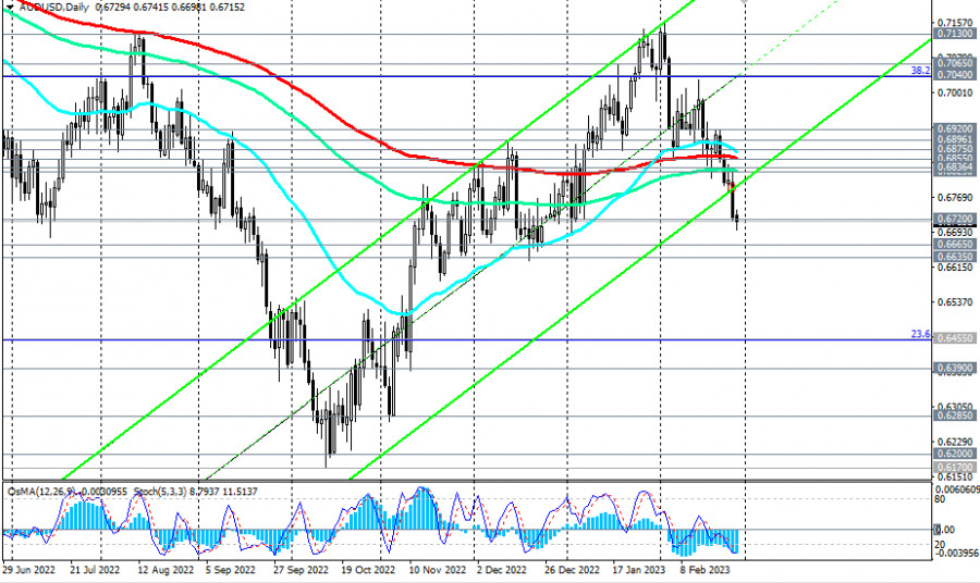 AUD/USD: сценарии динамики на 27.02.2023ИнстаФорекс - Instaforex, 2 года назад Подходит к концу февраль, месяц, оказавшийся крайне неудачным для австралийского доллара и пары AUD/USD, которая потеряла все наработки предыдущих 2-х месяцев и продолжает снижаться в сторону декабрьского минимума 0.6688. С пробоем на прошлой неделе ключевого уровня поддержки 0.6855 (ЕМА200 на дневном графике) пара вновь вернулась в зону устойчивого и долгосрочного медвежьего рынка. Технические индикаторы OsMA и Стохастик на дневном и недельном графиках также находятся на стороне продавцов. Ближайшие цели в случае дальнейшего снижения становятся локальные уровни поддержки 0.6665, 0.6635, а дальние цели находятся вблизи отметок 0.6200, 0.6170 (минимумы с апреля 2020 года). Пробой сегодняшнего минимума 0.6698 может стать сигналом для наращивания коротких позиций. Впрочем, как всегда, не исключается и альтернативный сценарий. По нему пара возобновит рост, направившись в сторону упомянутого выше ключевого уровня 0.6855. Пробой уровня сопротивления 0.6875 (ЕМА50 на недельном графике), а затем пробой локального уровня сопротивления 0.6920 может создать предпосылки для дальнейшего роста, возвращая AUD/USD в зону среднесрочного бычьего рынка, который чётко выражен на дневном графике цены восходящим каналом. Его верхняя граница на текущий момент проходит вблизи отметки 0.7300. Говорить о ее достижении пока рано. Но австралийский доллар, а значит и пара AUD/USD, имеют потенциал к дальнейшему росту, исходя из жесткой позиции руководства РБА относительно перспектив монетарной политики австралийского ЦБ. Самым ранним сигналом для начала реализации данного сценария может стать пробой сегодняшнего максимума и отметки 0.6741. А завтра и в среду утром, как мы отметили в нашем сегодняшнем «Фундаментальном анализе», следует ожидать ощутимого роста волатильности в котировках AUD и пары AUD/USD, соответственно. *) о событиях недели см. в Важнейшие экономические события недели 27.02.2023 – 05.03.2023 **) об особенностях торговли парой AUD/USD см. в статье AUD/USD: валютная пара (характеристики, рекомендации) Уровни поддержки: 0.6700, 0.6665, 0.6635 Уровни сопротивления: 0.6741, 0.6800, 0.6825, 0.6836, 0.6855, 0.6875, 0.6896, 0.6900, 0.6920