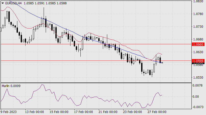 Прогноз по EUR/USD на 28 февраля 2023 годаИнстаФорекс - Instaforex, 2 года назад В понедельник на рынке вновь проявился интерес к риску: S&P500 +0,31%, EuroStoxx50 +1,66%. Но главным фактором роста евро стал рост рыночных ожиданий по ставкам ЕЦБ, которые резко поднялись до 3,9% к началу 2024 года. В результате цена преодолела сопротивление 1.0595 и уже нацелилась на 1.0660, углубляя коррекцию, которую мы ещё вчера ожидали не глубокой. Сигнальная линия осциллятора Марлин дневного масштаба развернулась вверх, помогая цене отработать верхнюю границу диапазона 1.0595-1.0660, являющуюся консолидацией 3-й декады декабря.